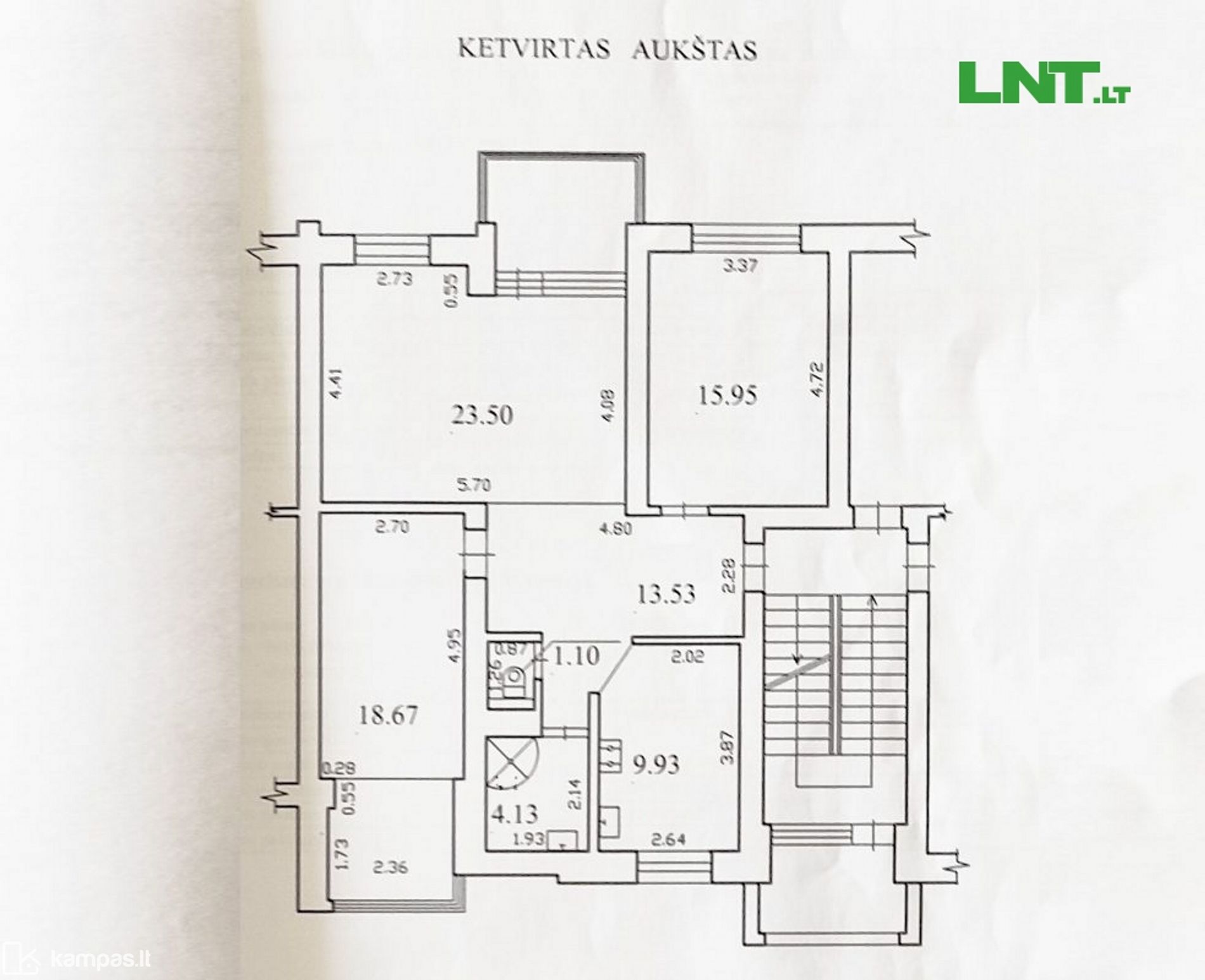 BUTO PLANAS: Atviro plano holas su svetaine – 37,03 kv.m.; Virtuvė – 9,93 kv.m.; Miegamasis – 15,95 kv.m.; Kambarys – 18,67 kv.m.; Vonios kambarys – 4,13 kv.m.; Tualetas – 1,10 kv.m.; ĮRENGIMAS: Sienos – dažytos, tapetai; Grindys – laminatas; Vonia ir tualetas – plytelės; Lauko durys – šarvo; Langai – plastikiniai; Nauja elektros instaliacija, vamzdynas.