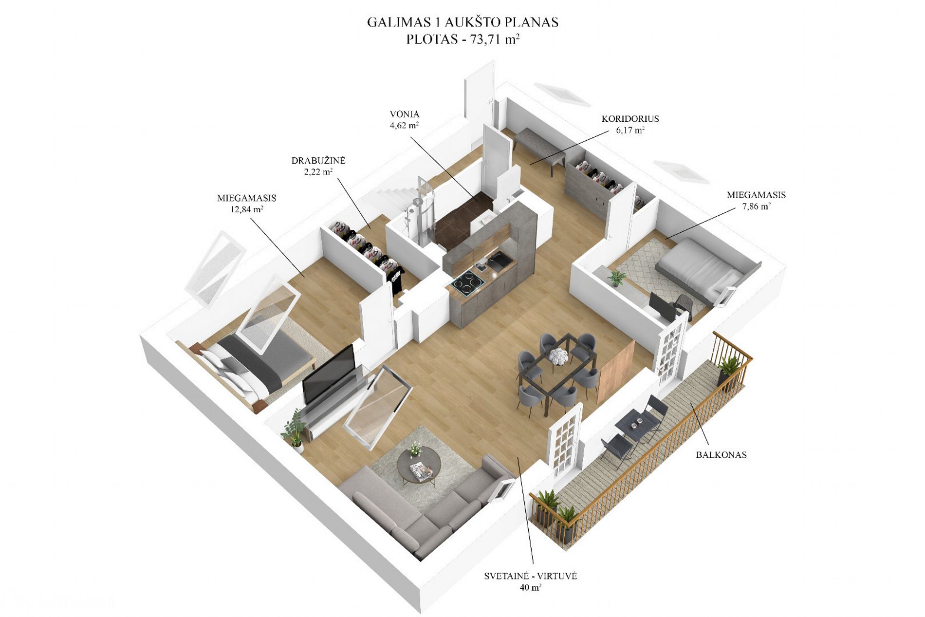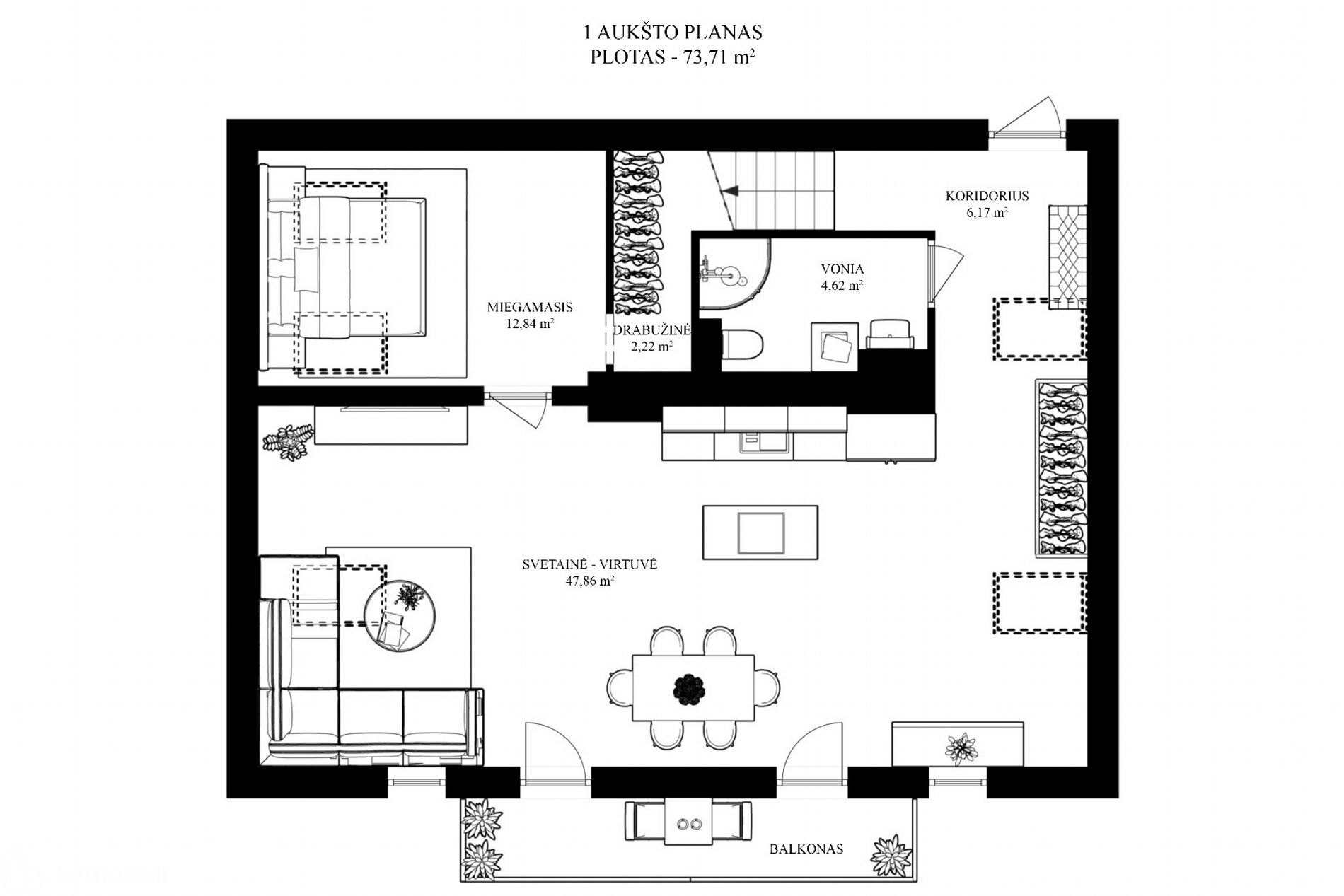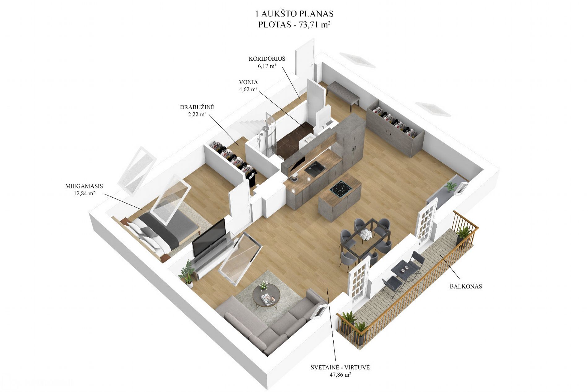 • Virtuvė su svetaine – 47,86 kv.m.;