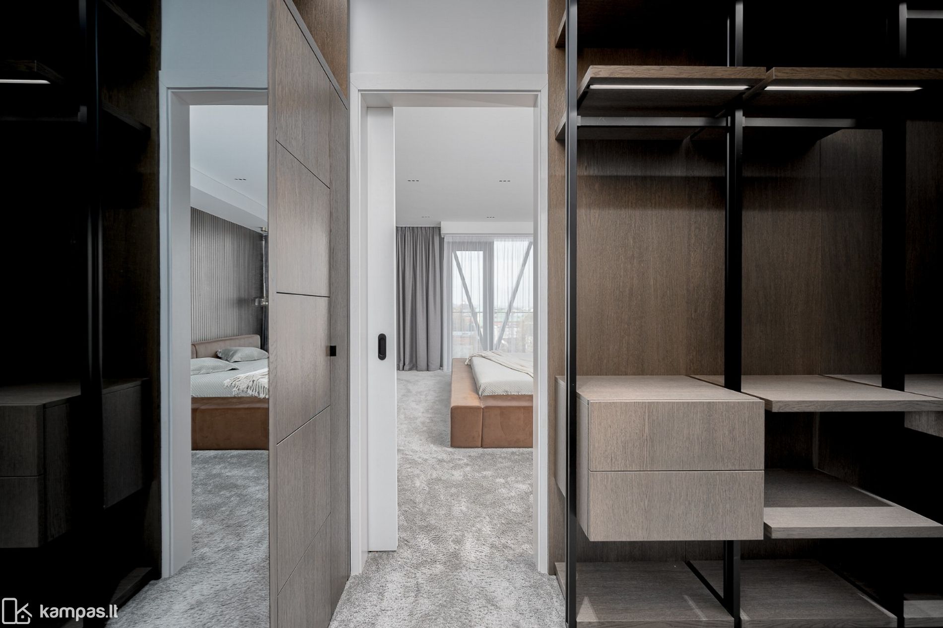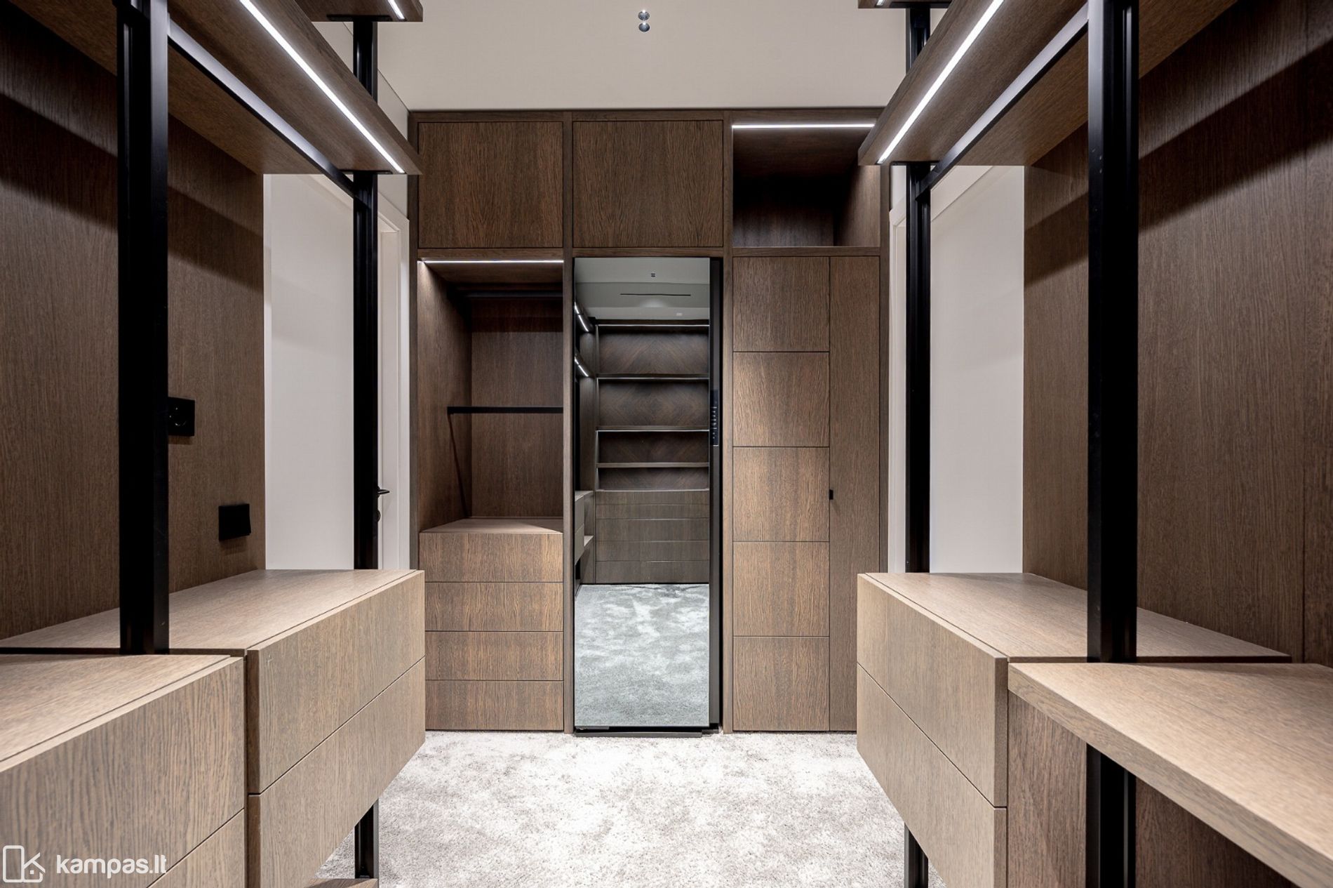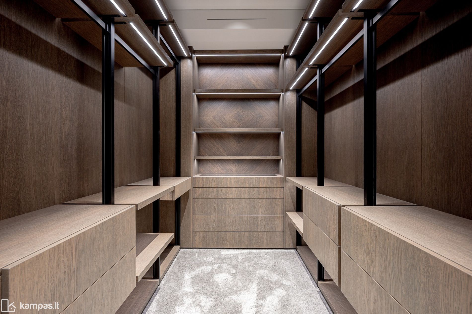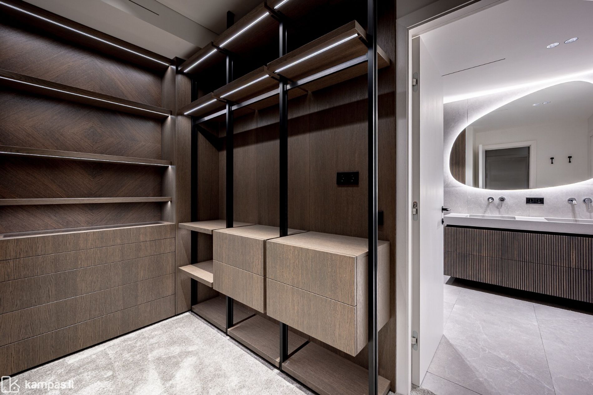 Apartamentuose itališki dizainerio šviestuvai. Drabužinėje - moderni drabužių spinta su integruota drabužių valymo funkcija.