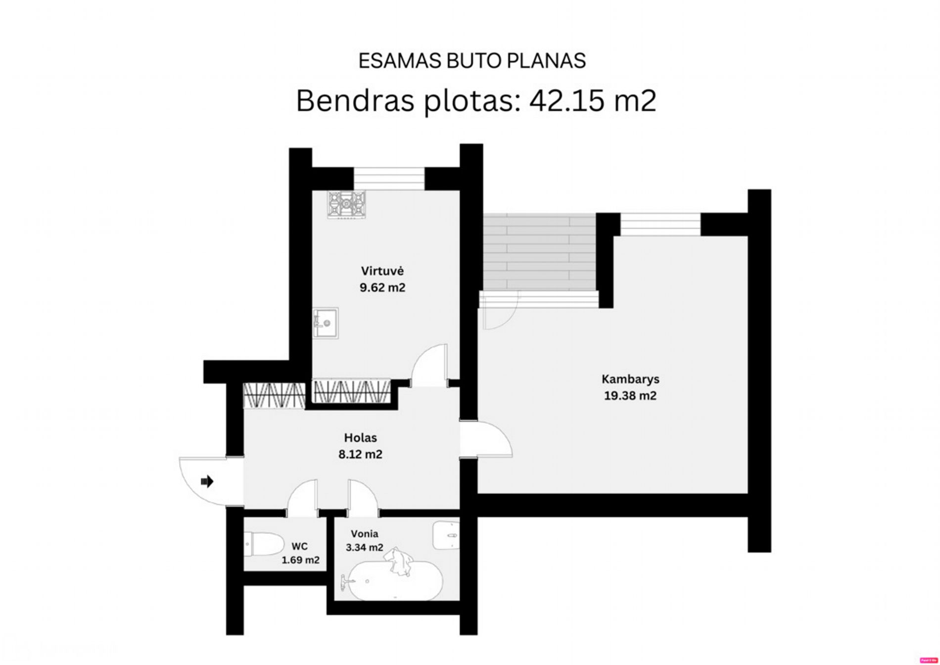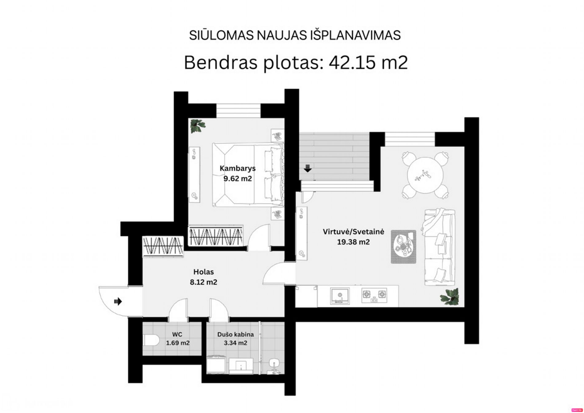 • Puiki galimybė perplanuoti erdvę į šiuolaikišką butą (žiūrėti planus ir vizualizacijas).