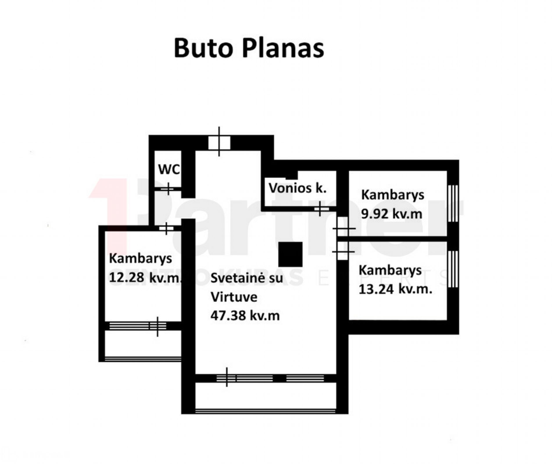 • Šildymas – centrinis (apie 120 Eur/mėn. šalčiausiu laikotarpiu).