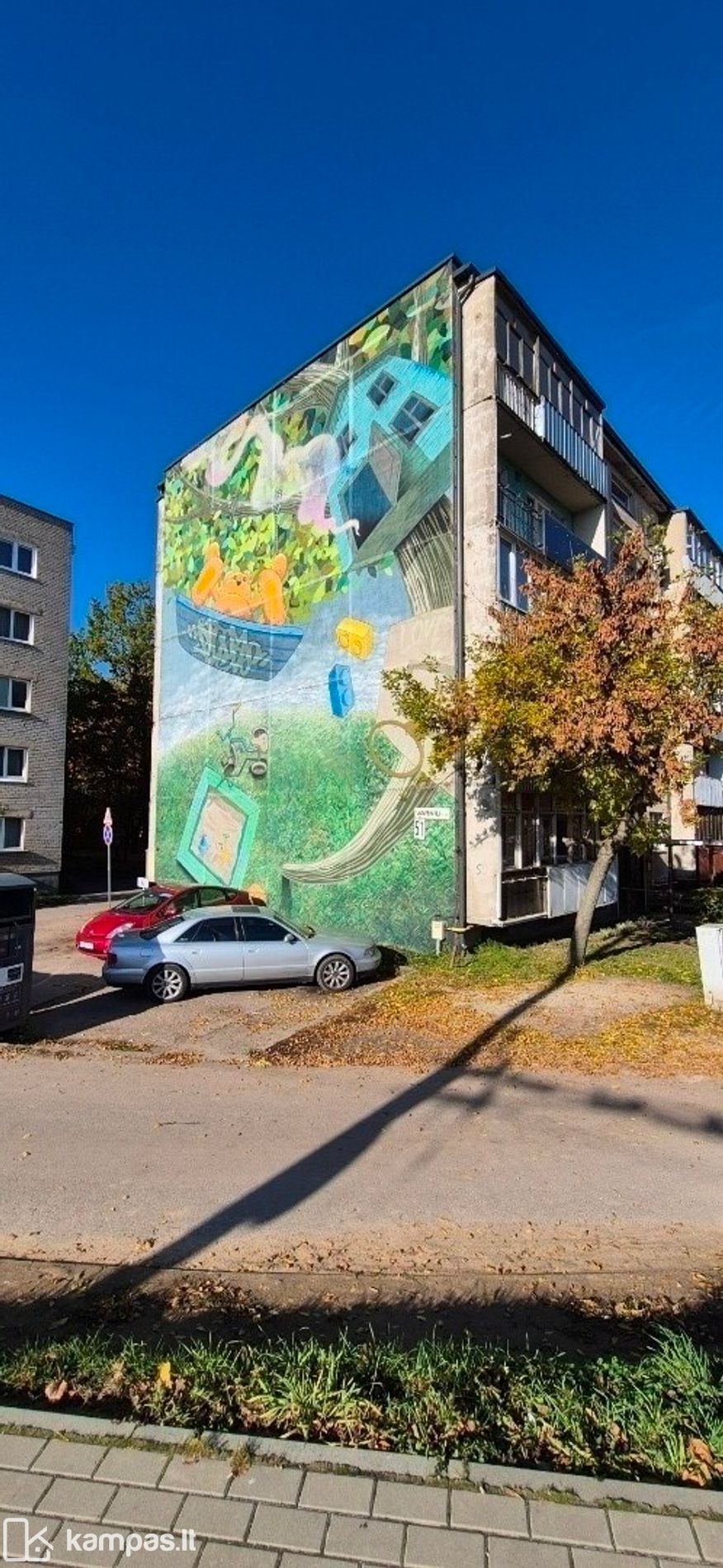 -Pastato šone esantis išskirtinis piešinys suteikia namui atpažįstamumo ir išskirtinumo. Street Art - Bear on a Swing