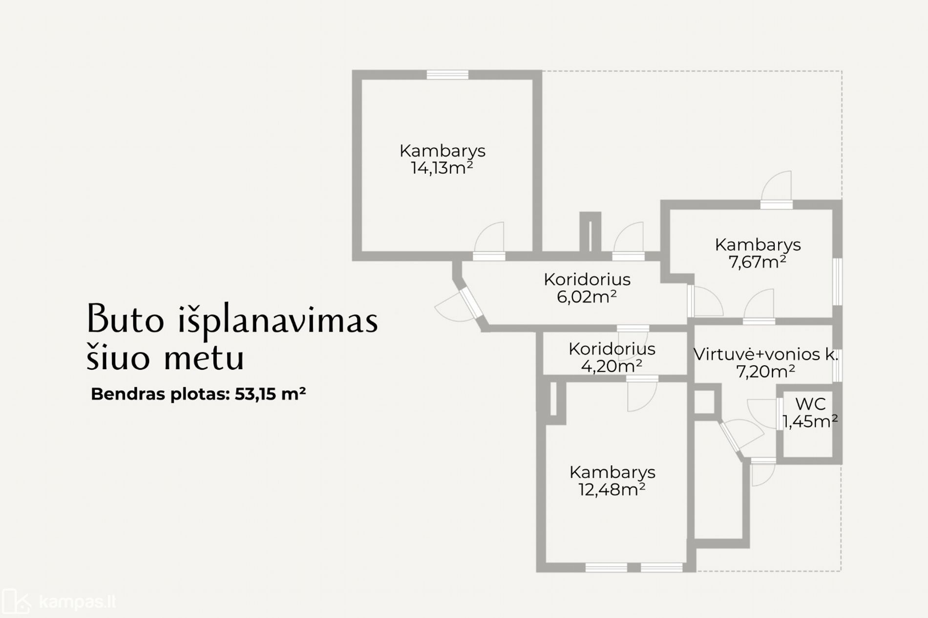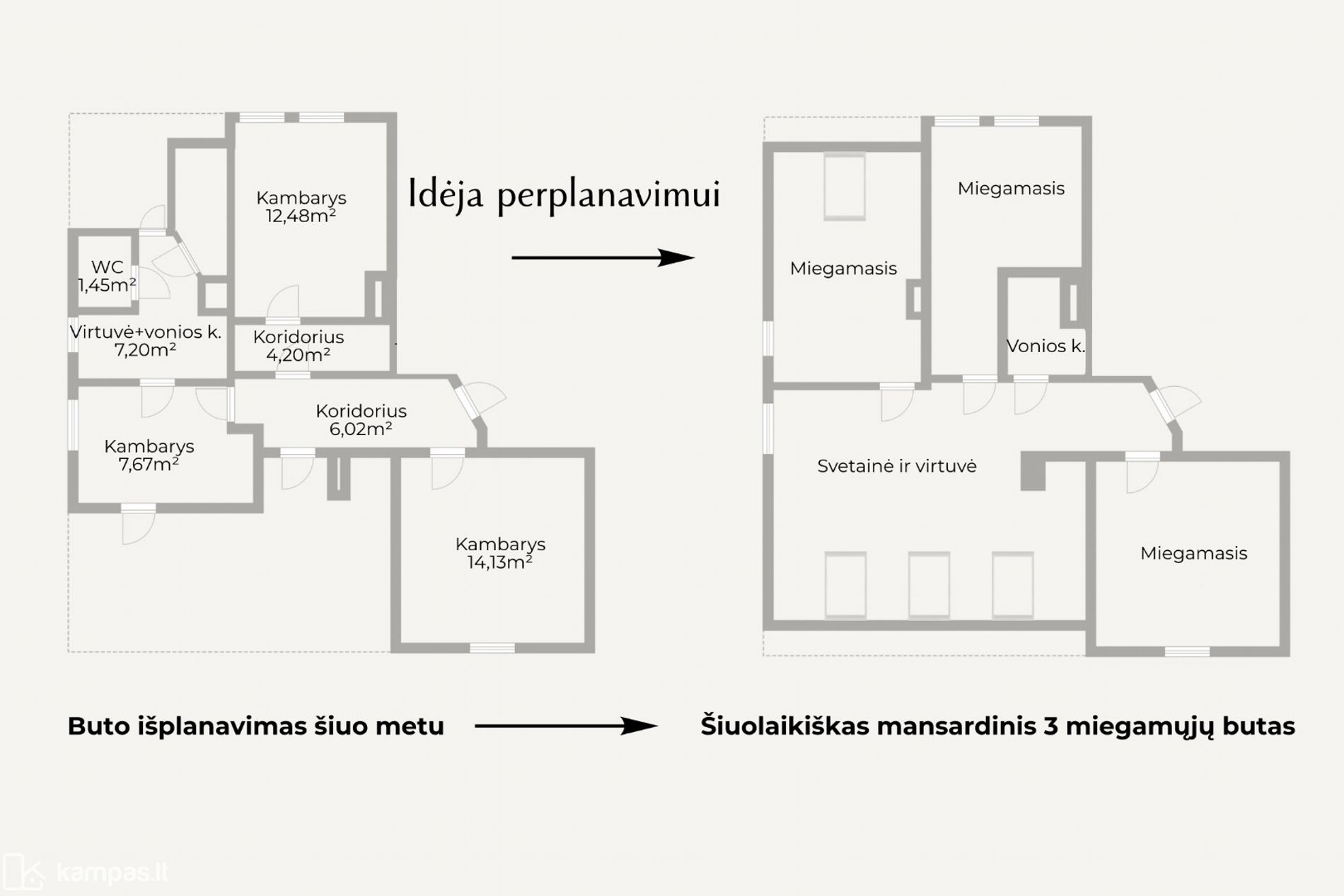 Šis butas įsikūręs istoriniame 1929 m. statybos mediniame name, trečiajame aukšte (mansarda). Tai – 53,15 kv. m. erdvės, kurią galima paversti tikra stiliaus ir komforto oaze. Bute reikalingas remontas, tad tai puiki galimybė įgyvendinti savo viziją, nors galima gyventi ir esamomis sąlygomis.