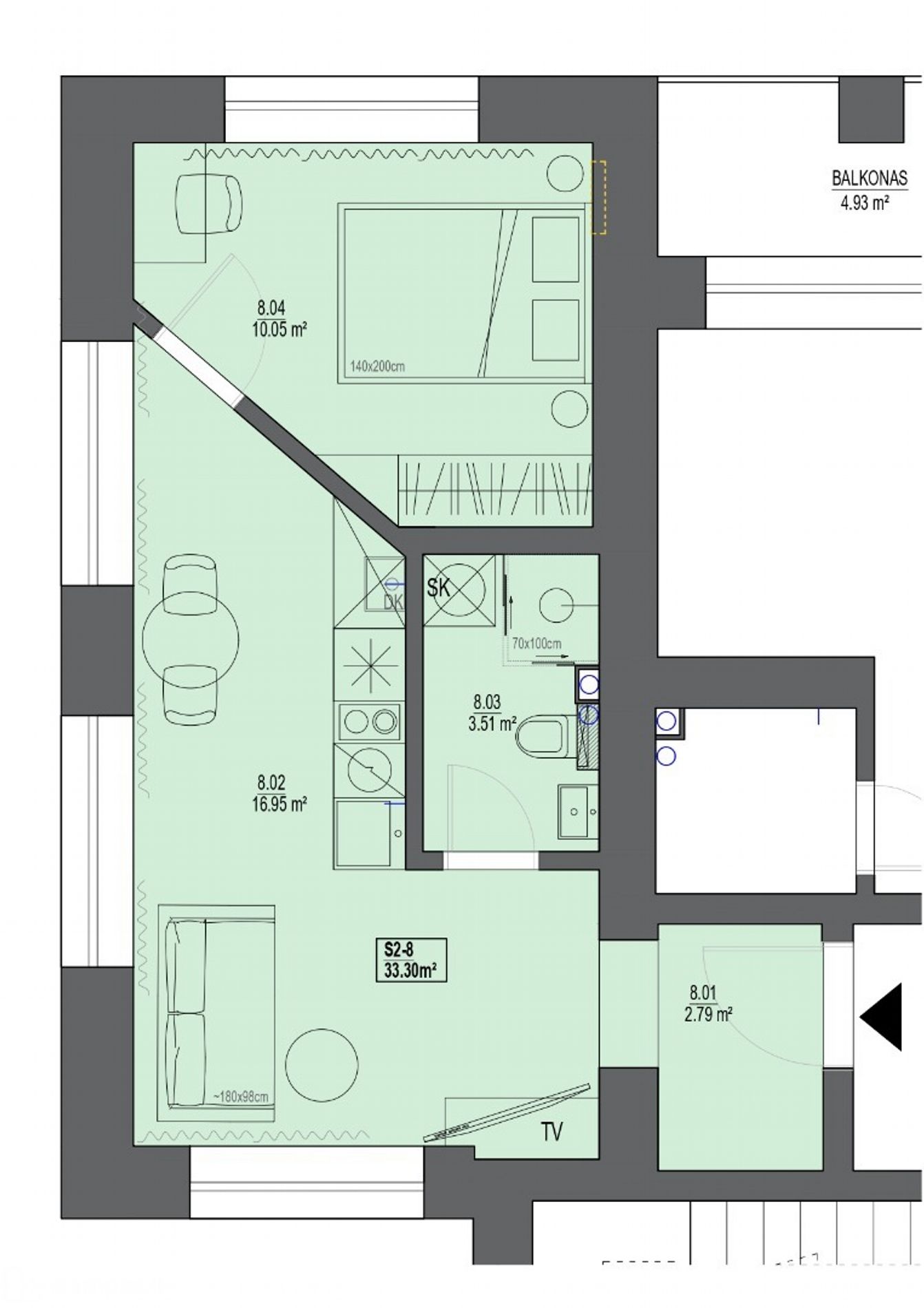* Plotas nuo 28,63 kv. m. iki 33,3 kv. m.;