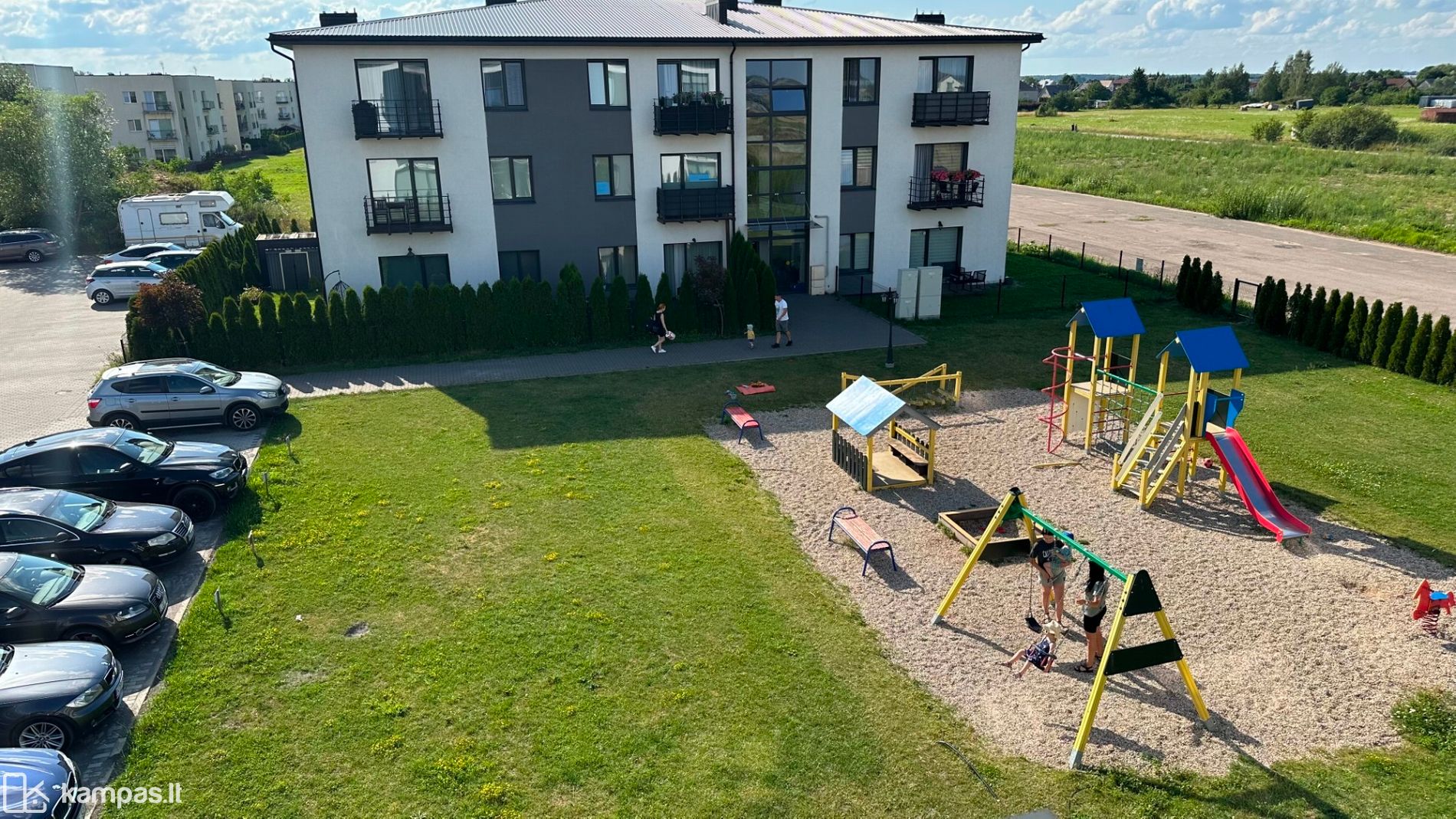 Aptvertas, saugus kiemas su atitvaru ir žaidimų aikštele vaikams.