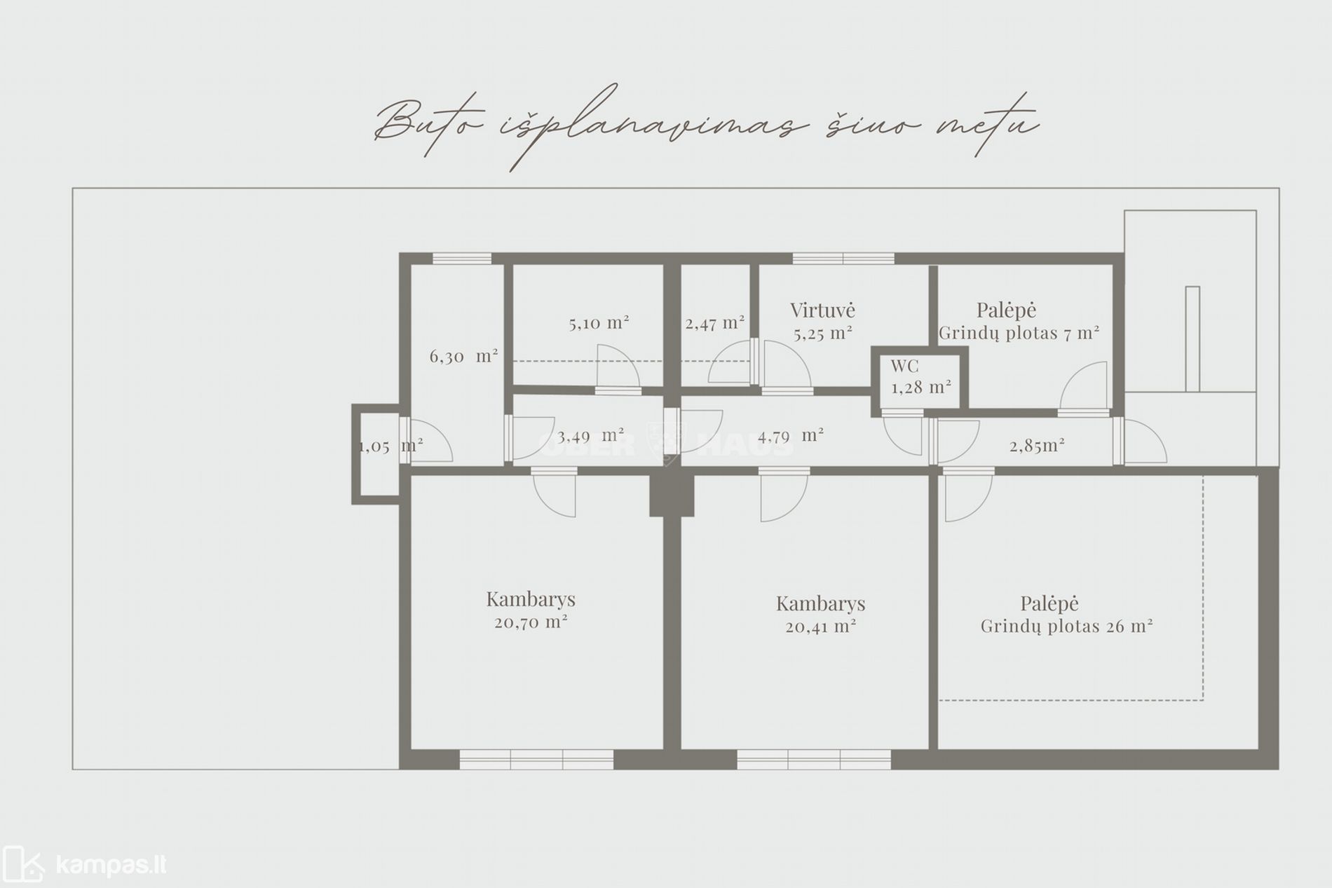 Su butu parduodamos dvi, šalia buto esančios ir iš buto įeinamos, palėpės patalpos, kurių grindų plotas 7 ir 26 m².