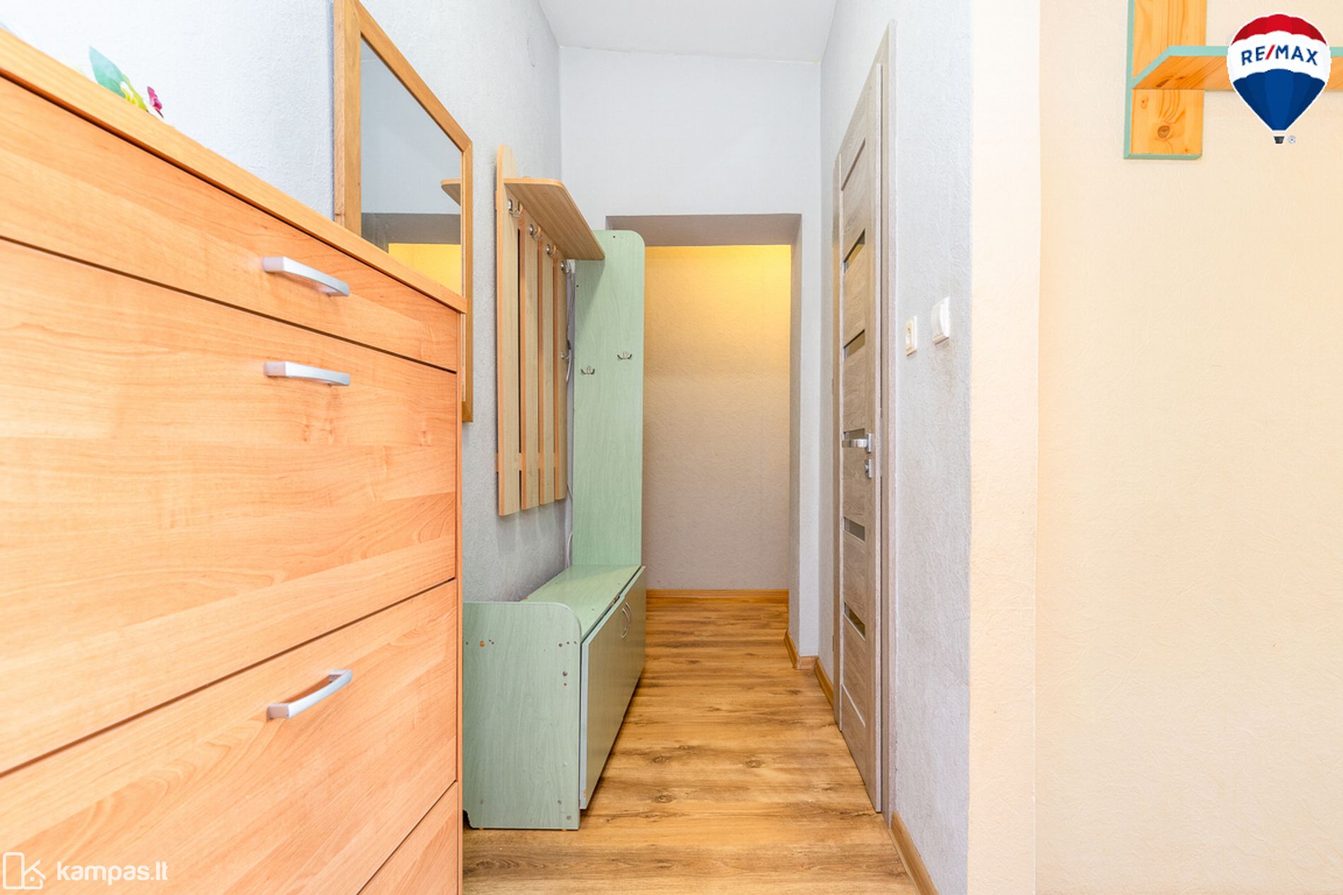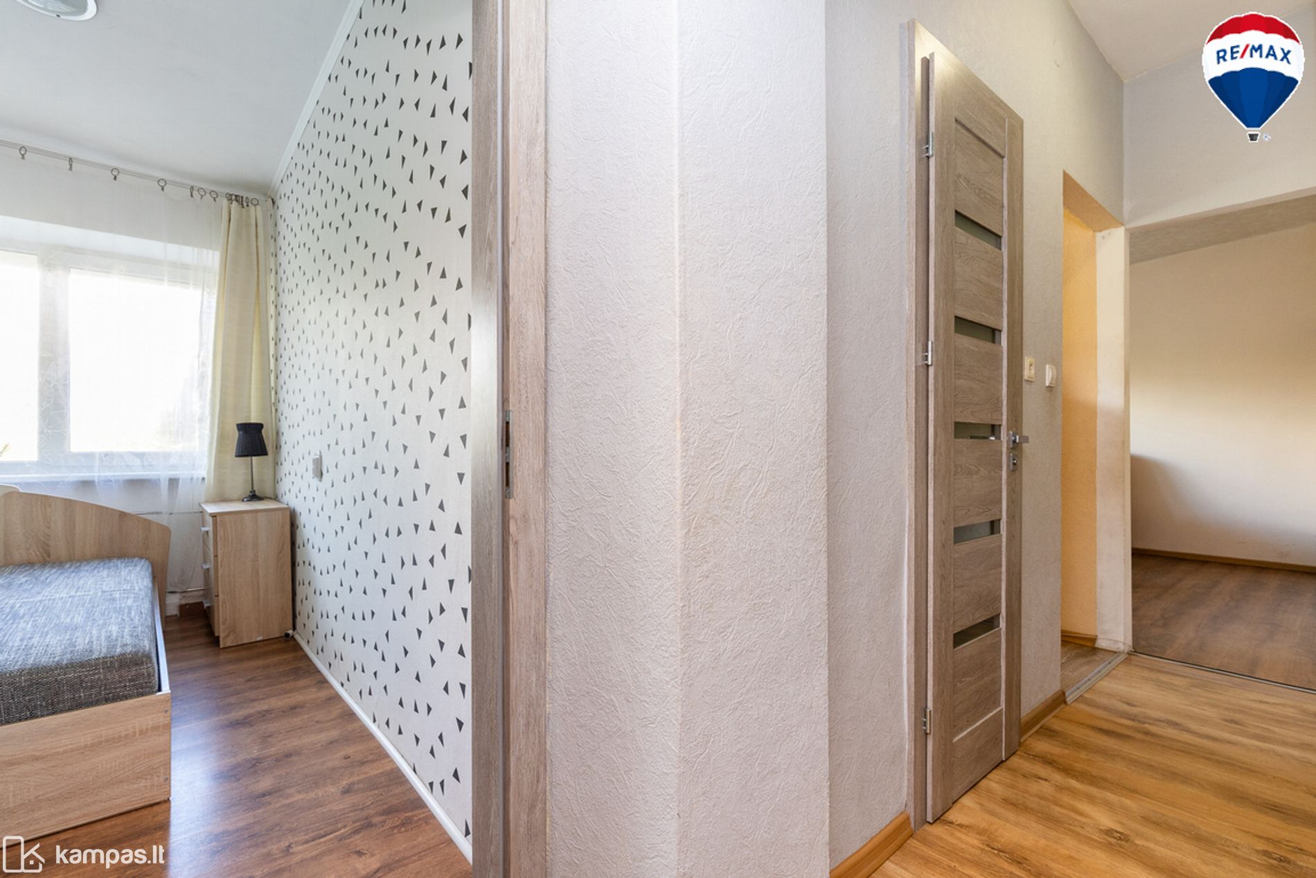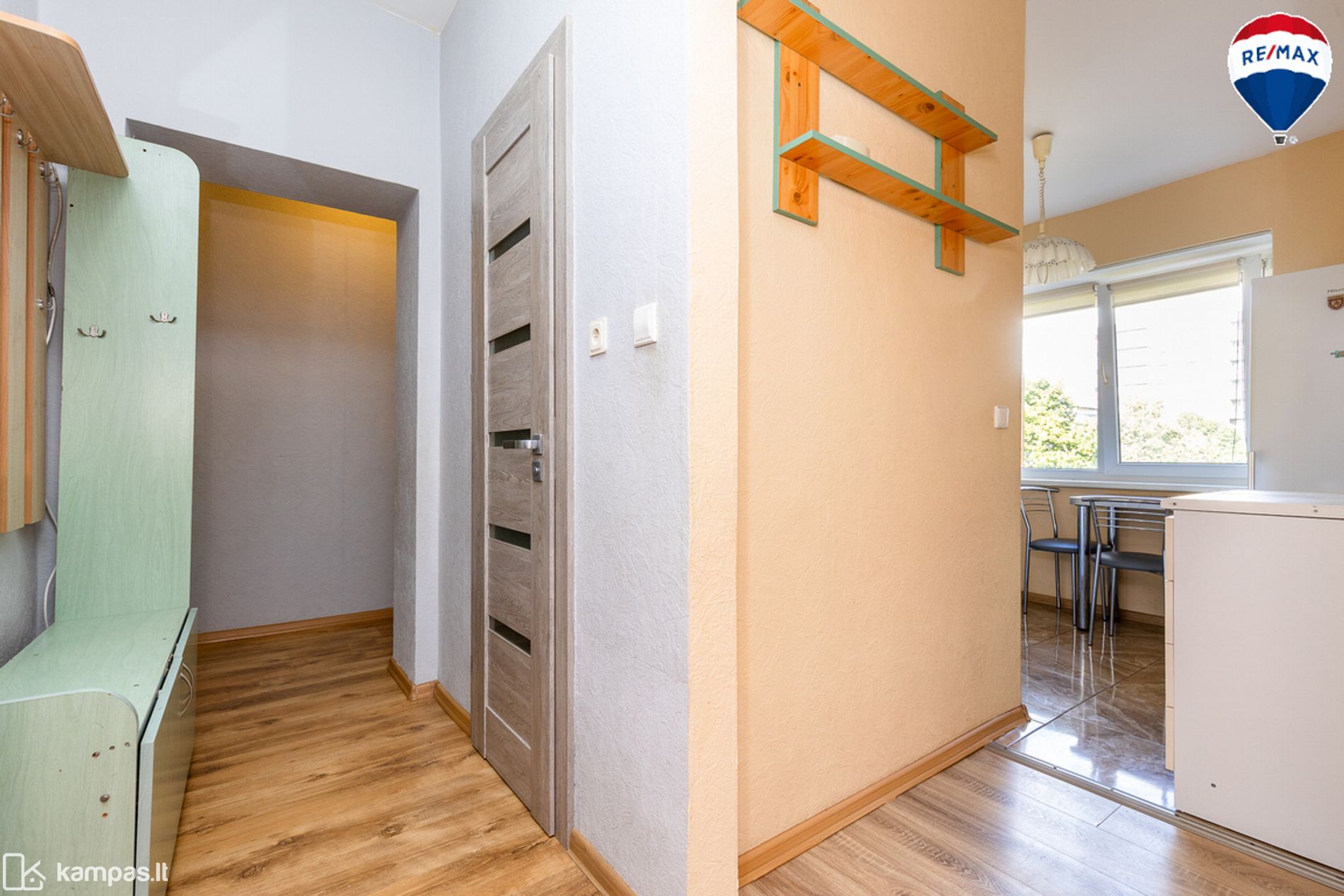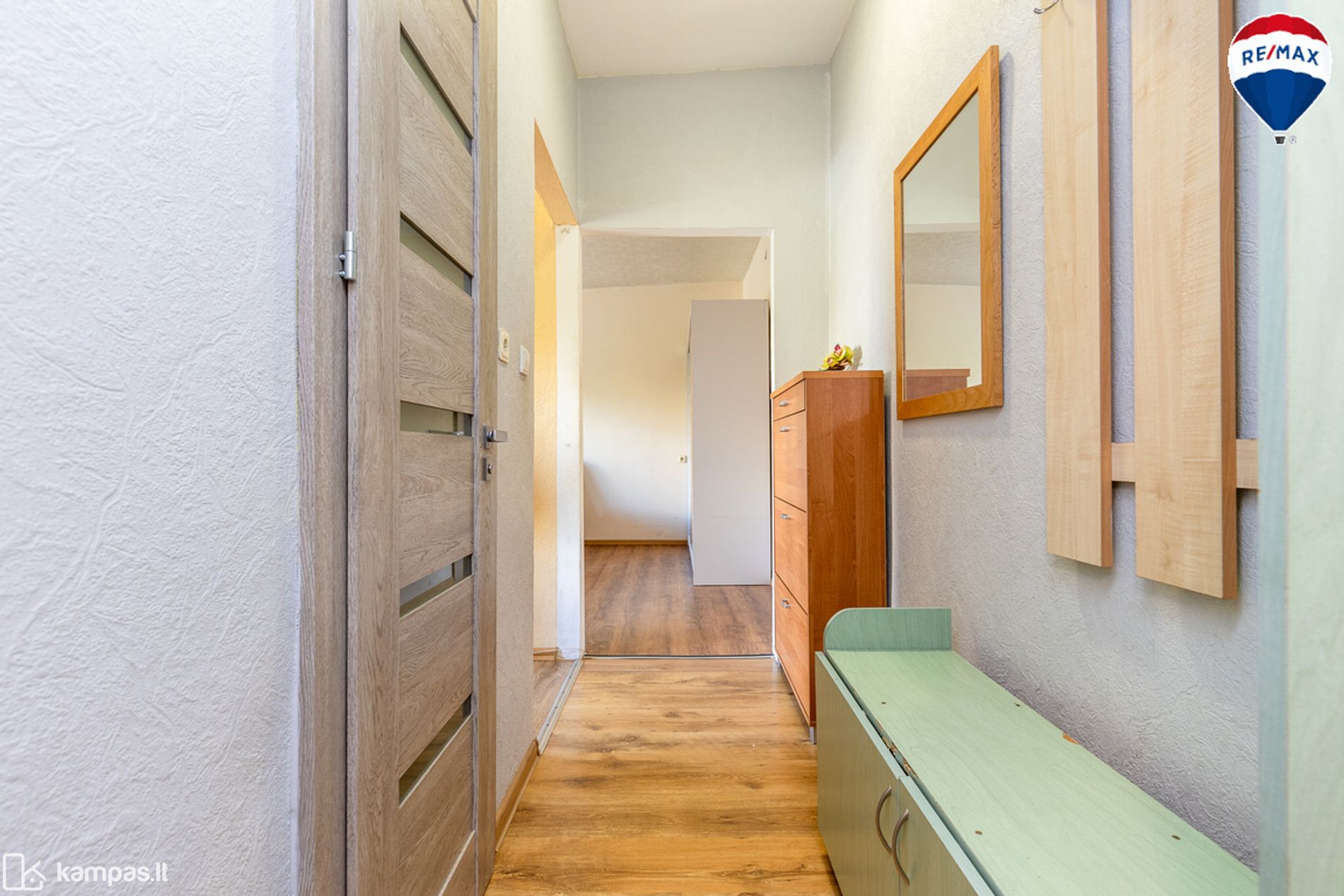 - Grindys – laminuota grindų danga, vonios kambaryje ir virtuvės zonoje – plytelės;