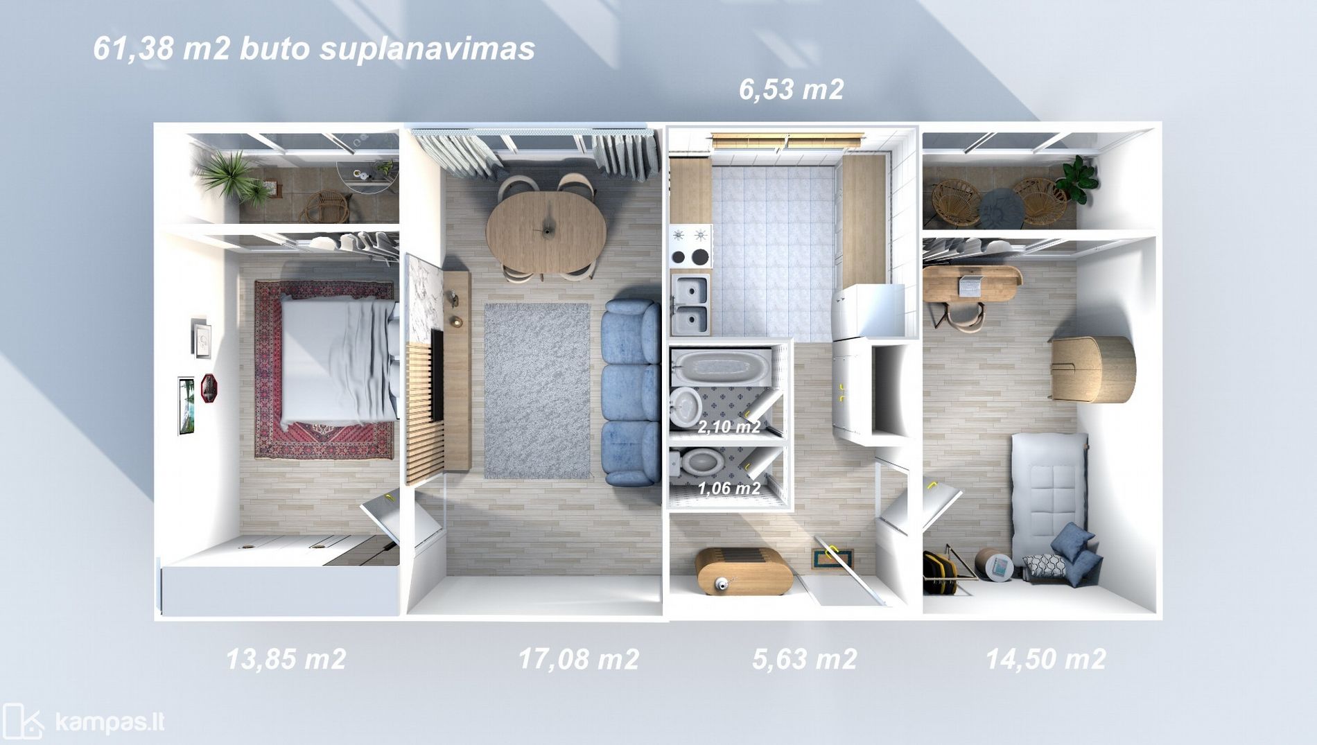 • Bendras plotas – 61.38 kv.m.;