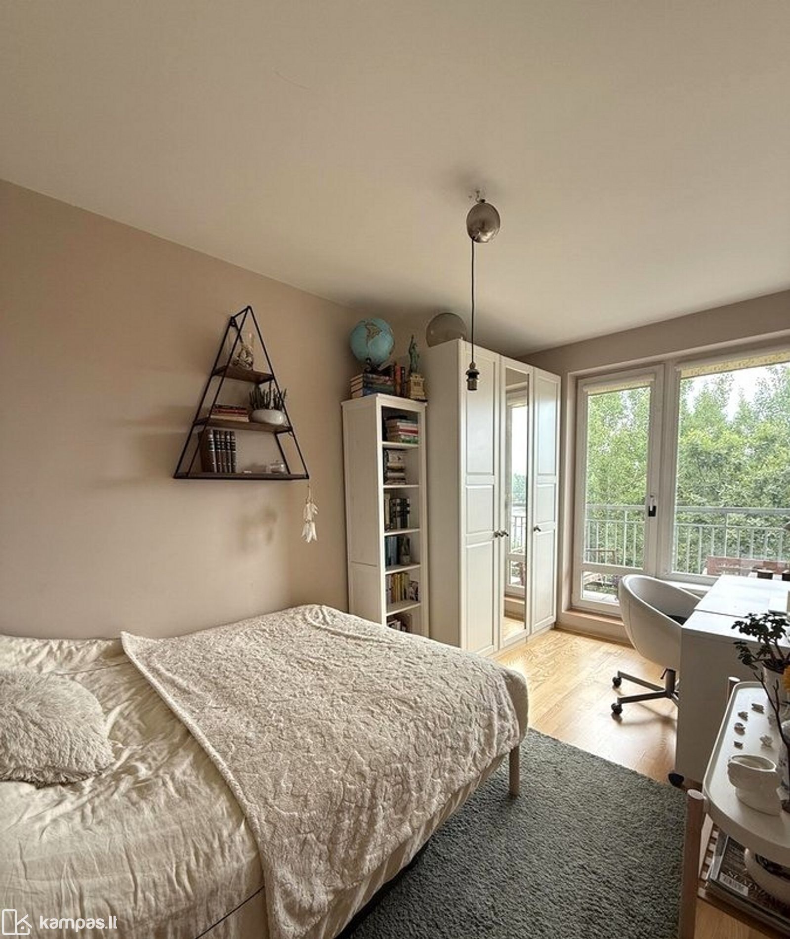 Per du kambarius didelis balkonas, 10 kv.m, išėjimas į jį iš abiejų kambarių.