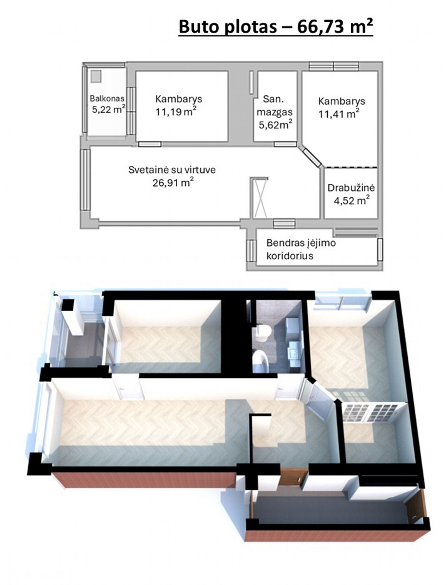 • Kambarių skaičius: 3 (2 miegamieji + svetainė su virtuve)