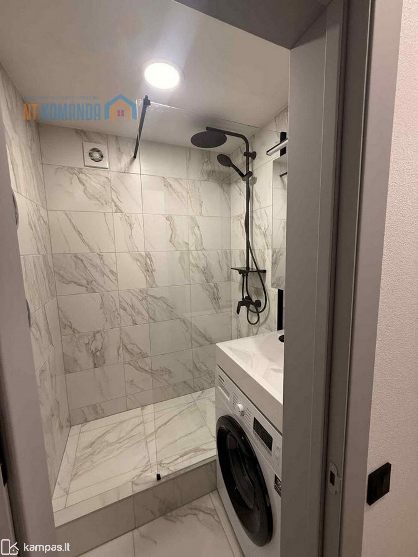 Vonios kambaryje: dušas, skalbimo mašina, kriauklė.