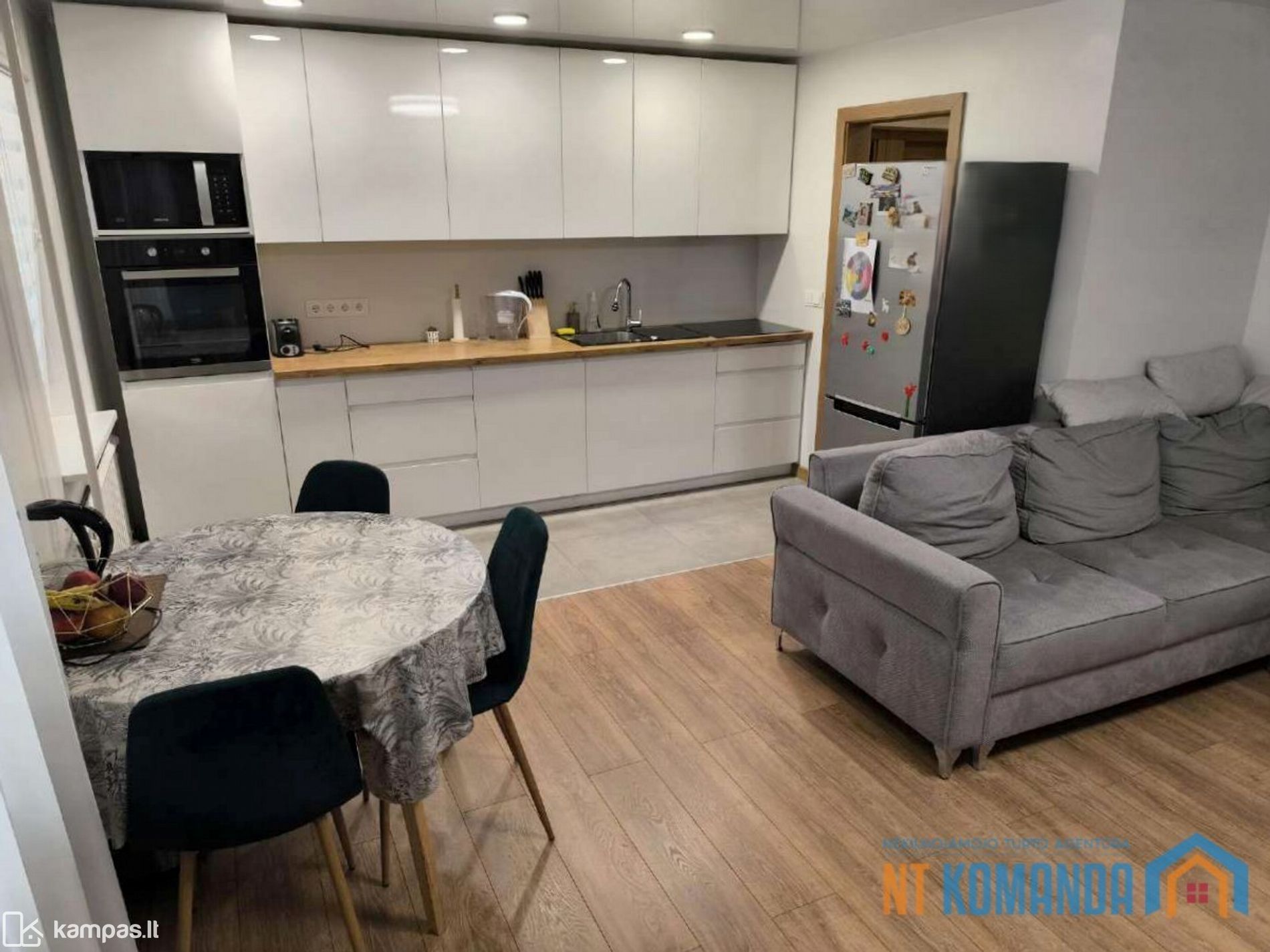 - 3 kambariai: svetainė sujungta su virtuve, du miegamieji;