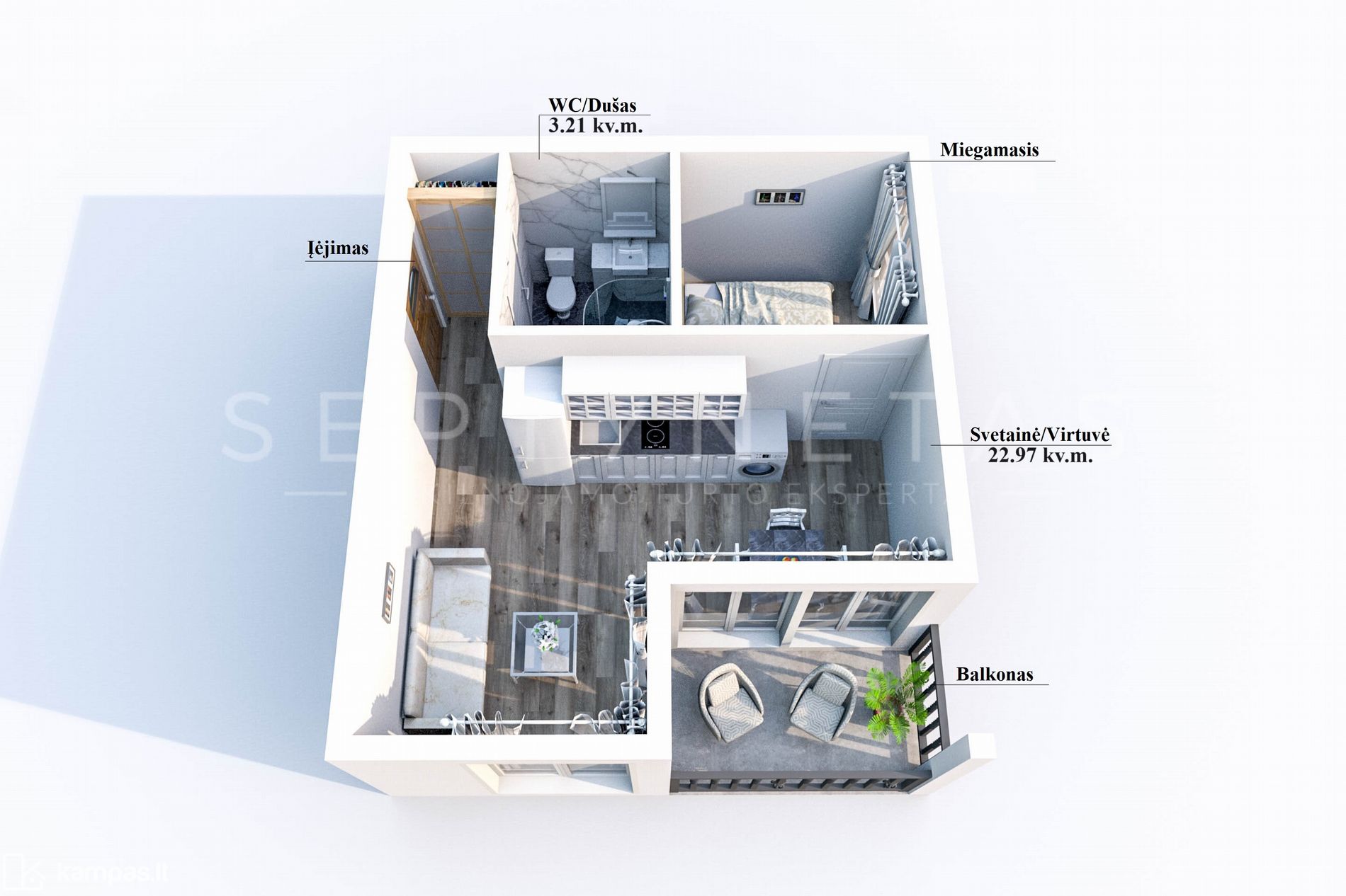 - Apartamentų plotas – 31.18 kv. m. (26.18 kv. m. apartamentų ploto + 5 kv. m. balkono plotas);