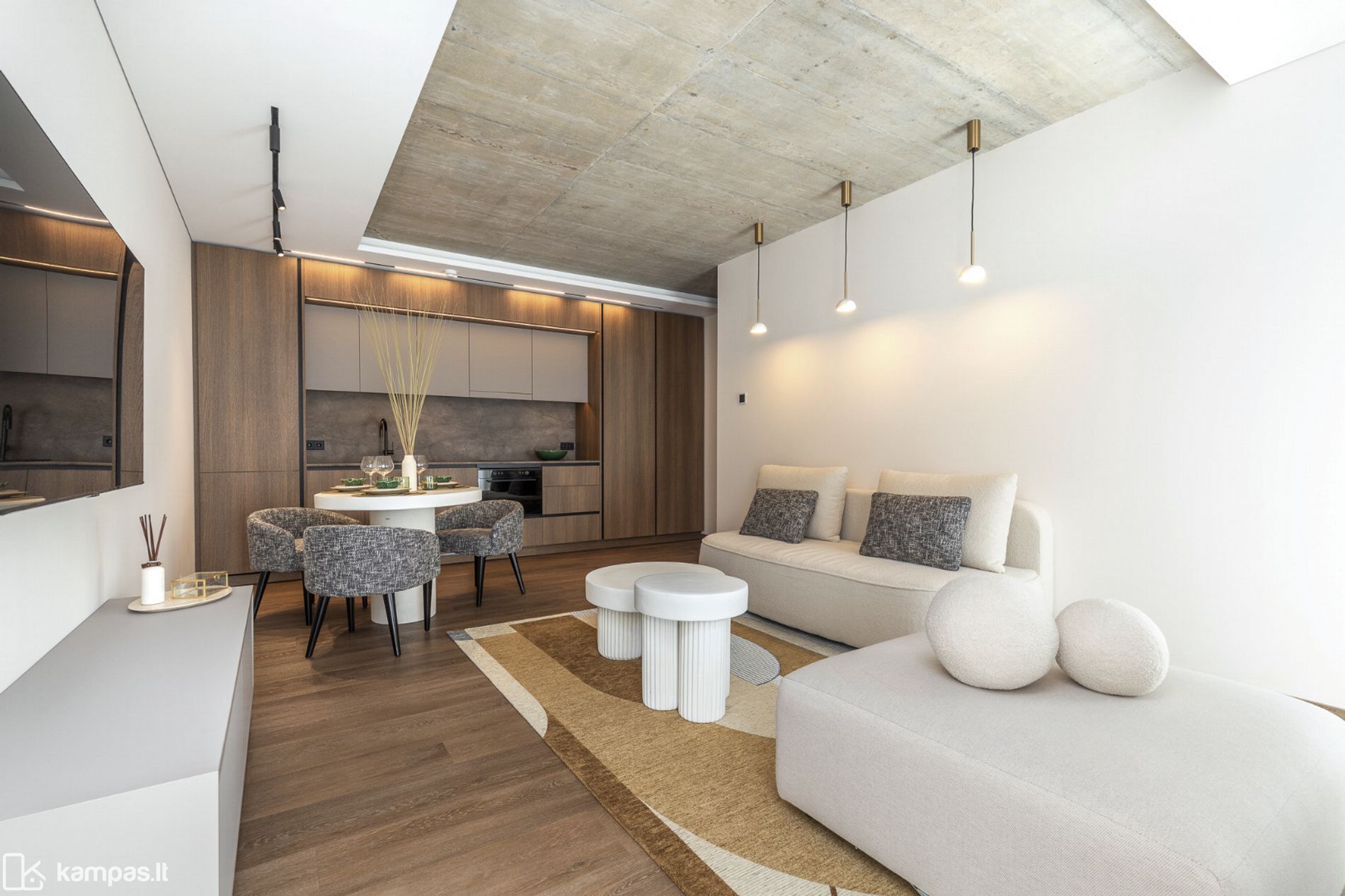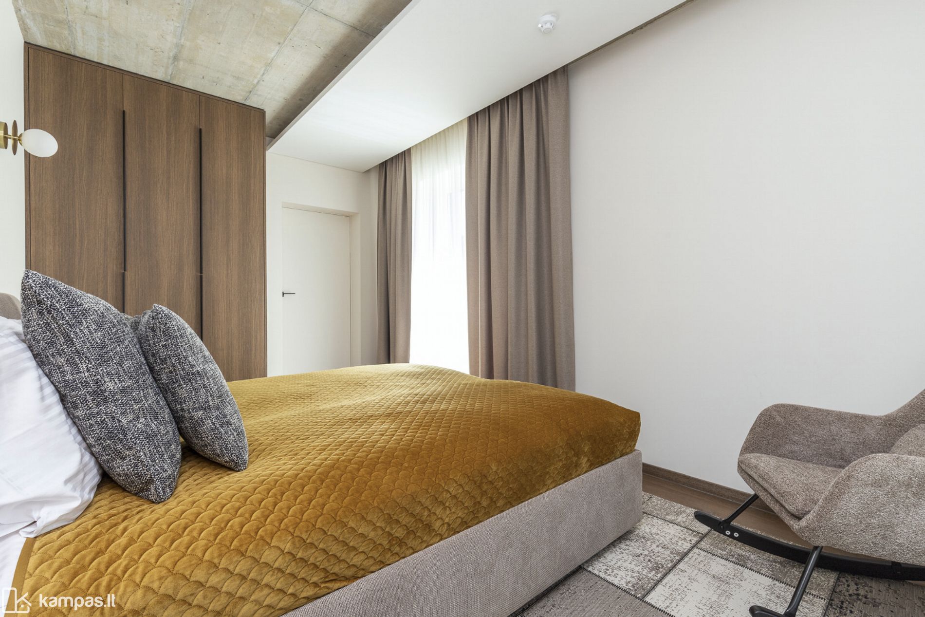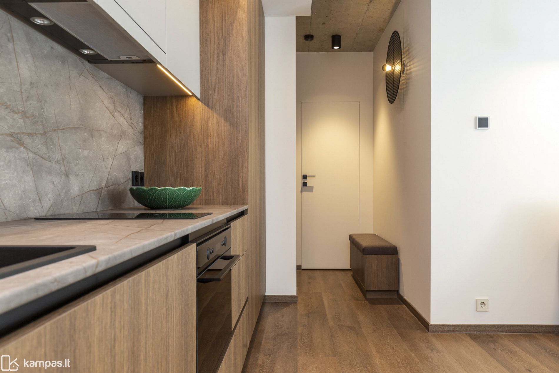 • 2 kambariai (miegamasis ir erdvi svetainė, sujungta su virtuve);
