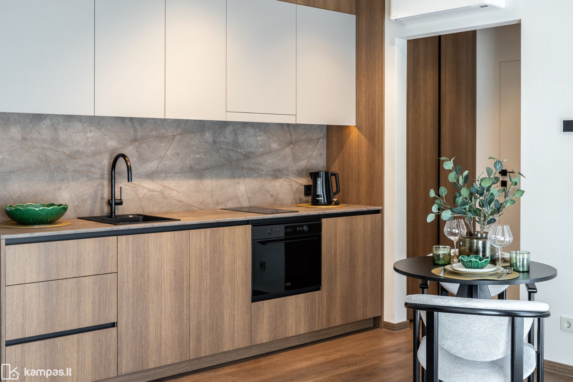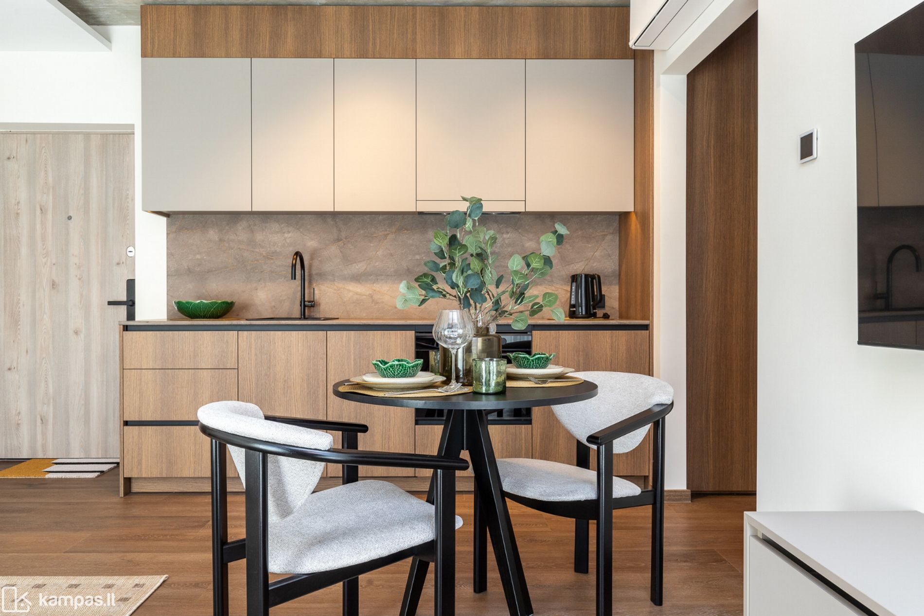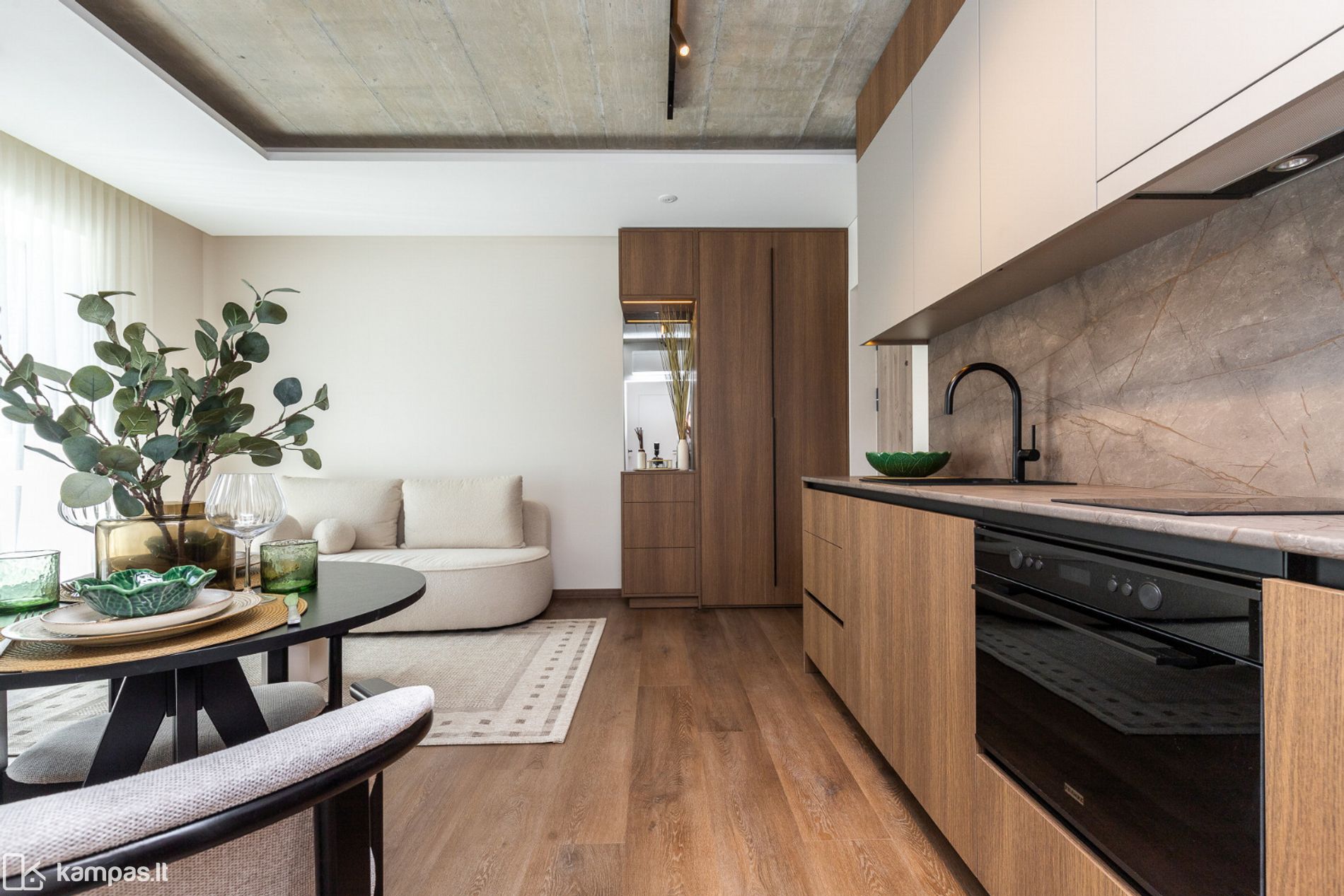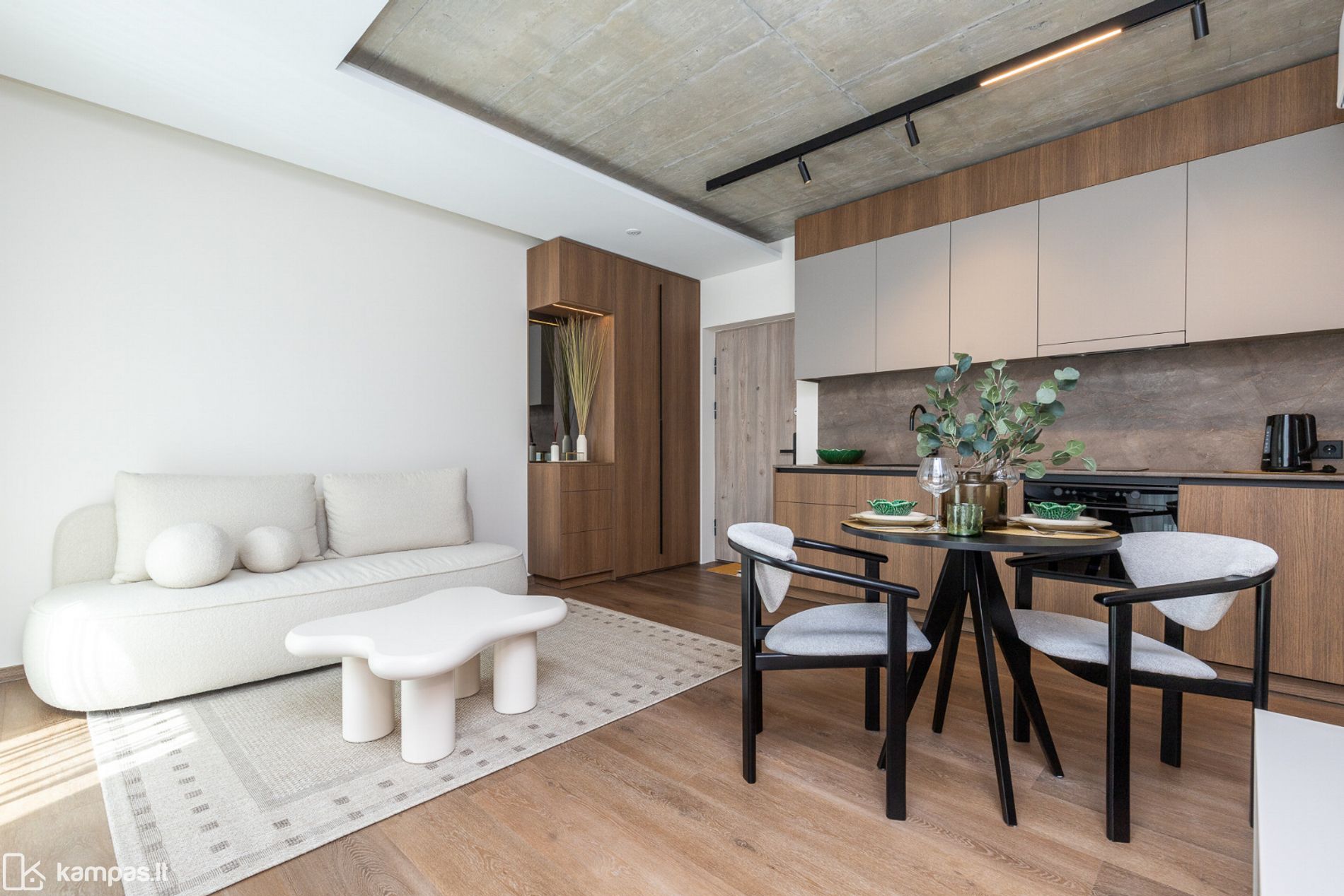 • 2 kambariai (miegamasis ir svetainė, sujungta su virtuve);