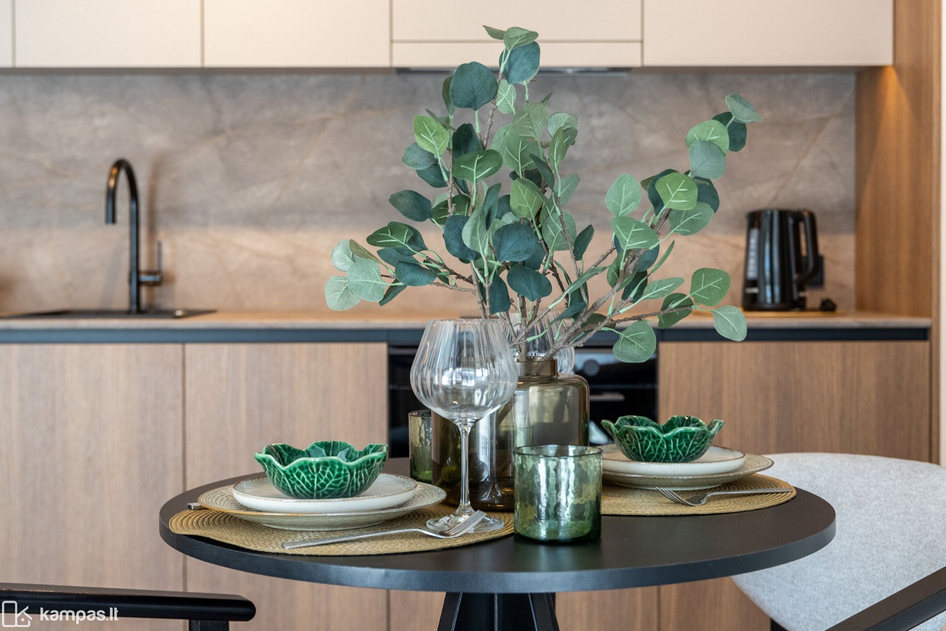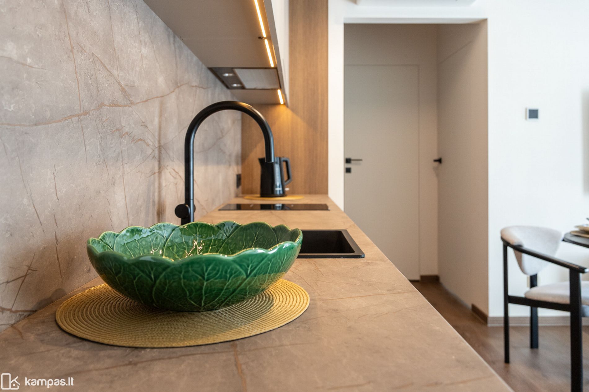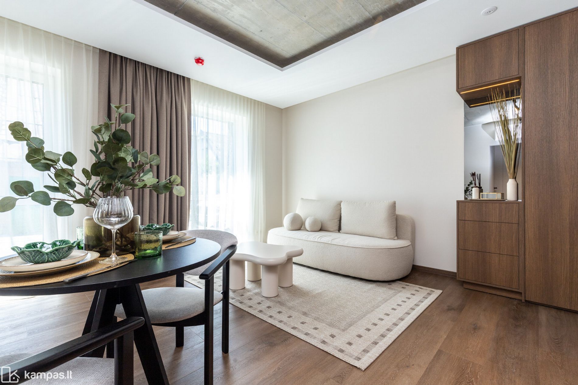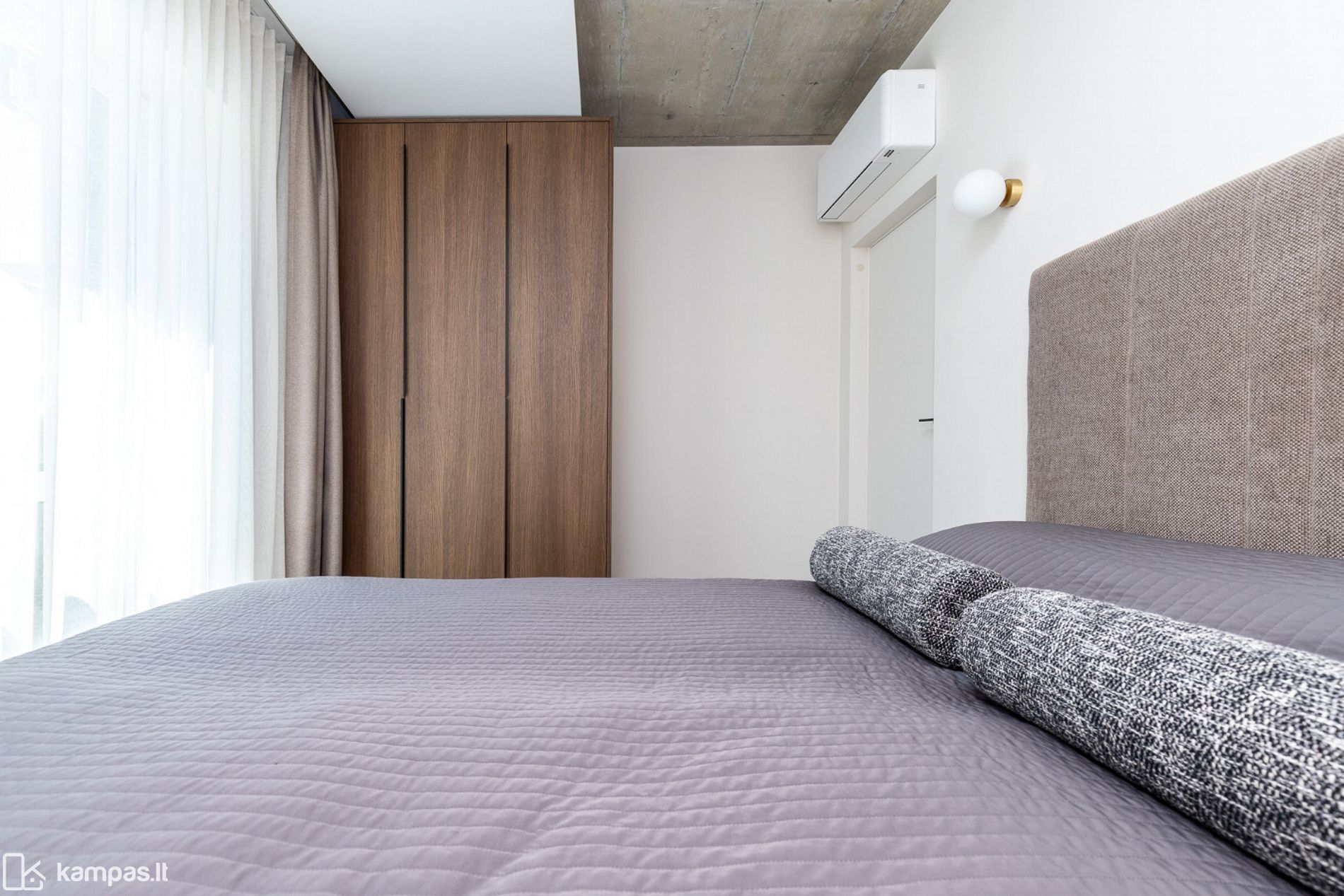 • 2 kambariai (miegamasis ir svetainė, sujungta su virtuve);
