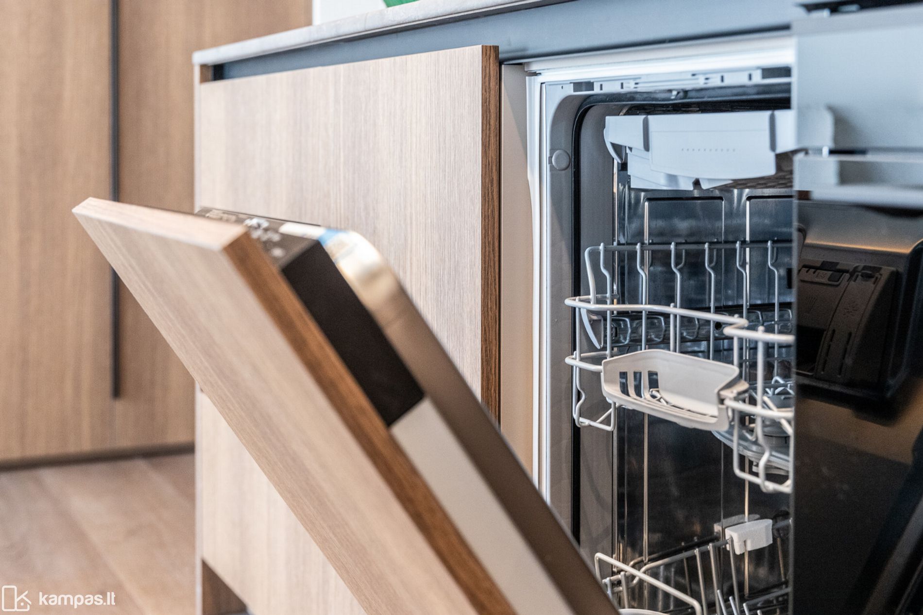 • Virtuvė su integruota buitine technika (indaplovė, šaldytuvas, gartraukis, viryklė, orkaitė su mikro- bangų funkcija); taip pat skalbimo mašina, TV.