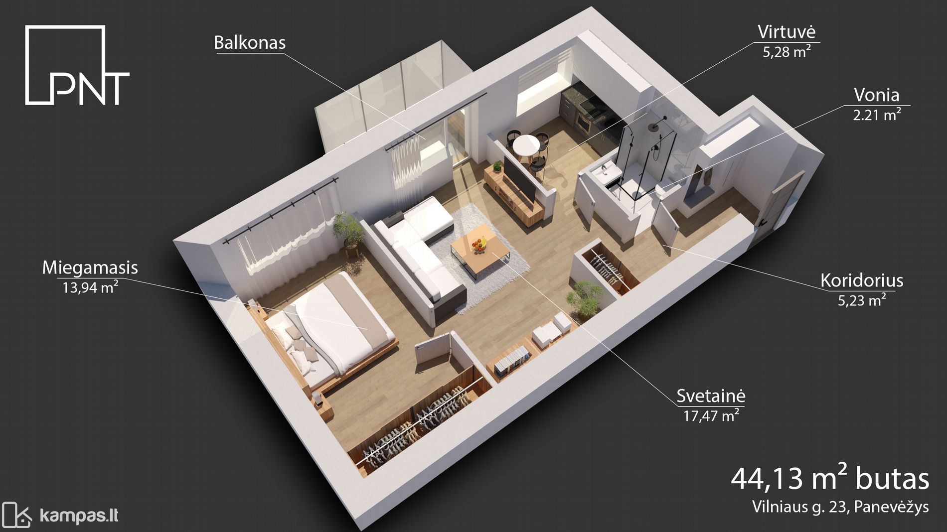 - Bendras plotas – 44,13 kv. m