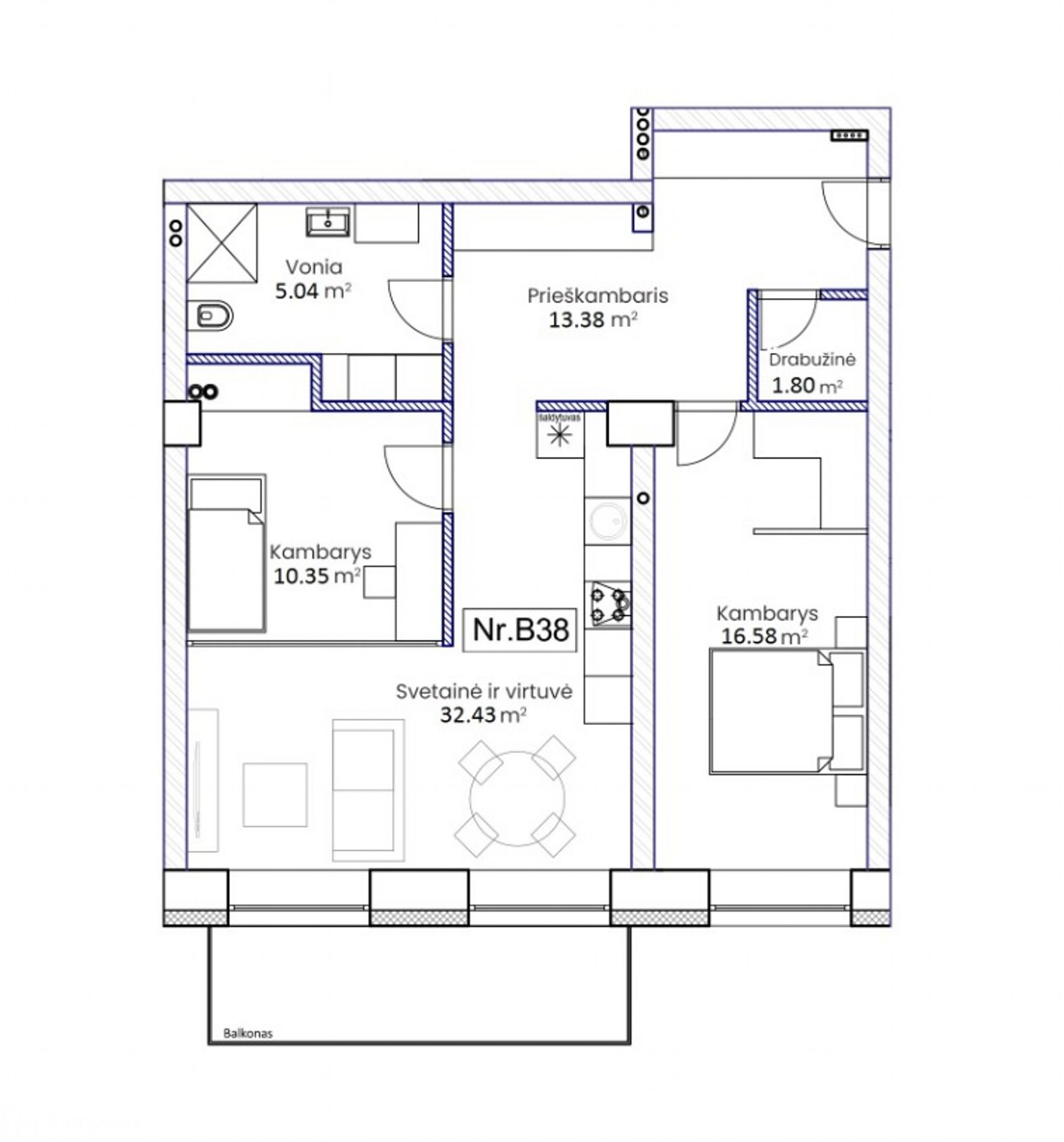 - Svetainė sujungta su virtuve: 32.43 kv. m.