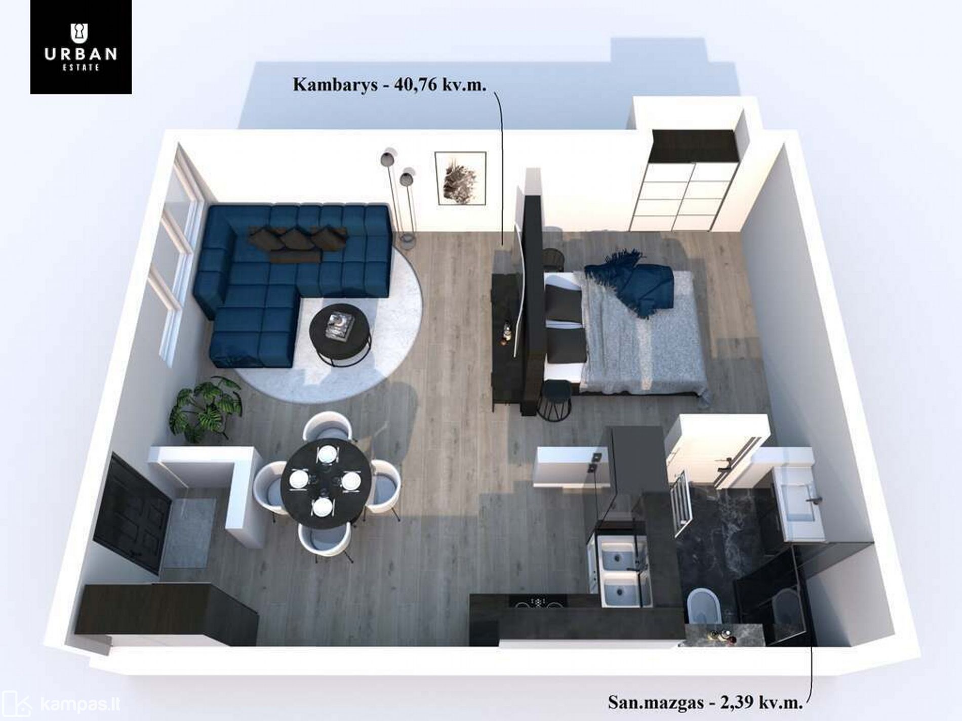 - Svetainė sujungta su virtuve ir atskira miegamojo erdvė;