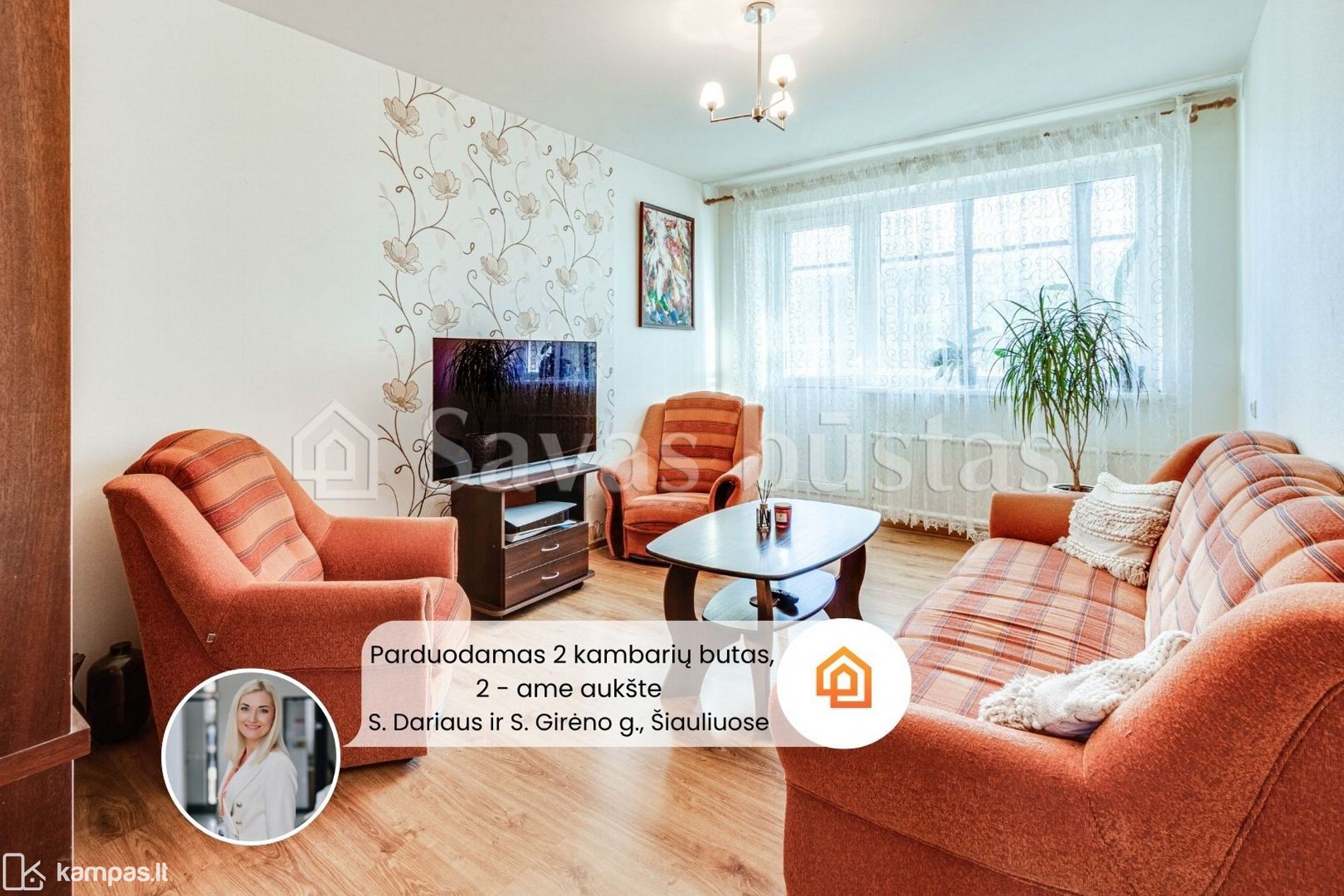 Parduodamas 2 kambarių butas Šiauliuose, S. Dariaus ir S. Girėno g. 10. Namas 1969 m. statybos. Butas ne kampinis, 2 - ame aukšte iš 5 - ių. Bendras buto plotas 46,05 kv. m. Butui priklauso 3,08 kv. m rūsys. Butas tvarkingas, tačiau reikia remonto pagal poreikį. Patogus išplanavimas, nepereinami kambariai. Įstatytos dvigubos medinės durys. Langai -plastikiniai. Įstiklintas balkonas. Atnaujinti namo vamzdynai. Kambariuose sienos tapetuotos. Koridoriuje ir virtuvėje sienos iškaltos medinėmis lentelėmis. Grindys išklotos laminuota grindų danga. Vonios ir WC patalpa išklijuota plytelėmis. Butas parduodamas su visais jame esančiais baldais bei buitine technika.