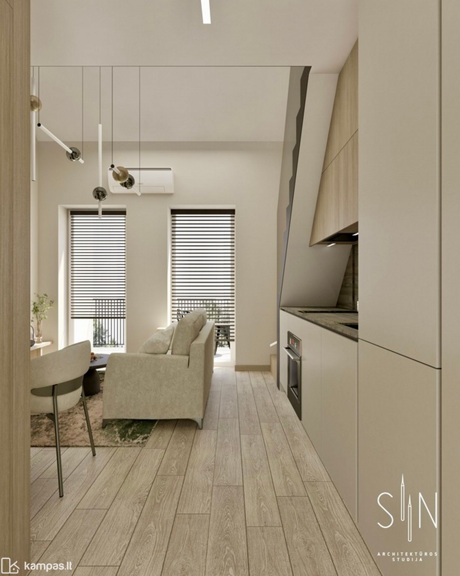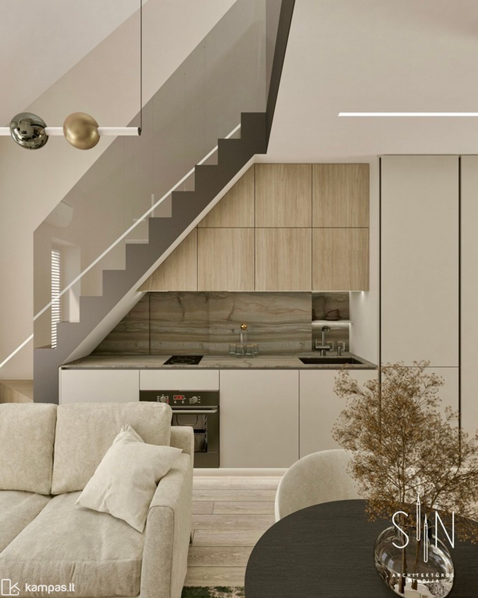- svetainė sujungta su virtuve – 19,50 kv.m.;