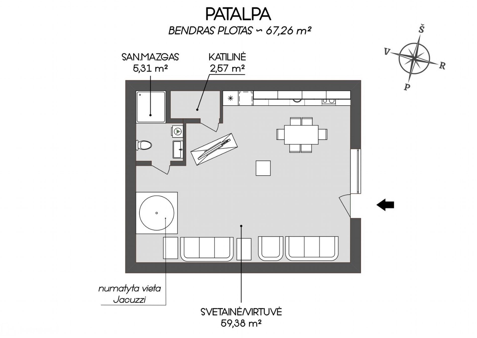 • Svetainė/Virtuvė - 59,38 kv.m;