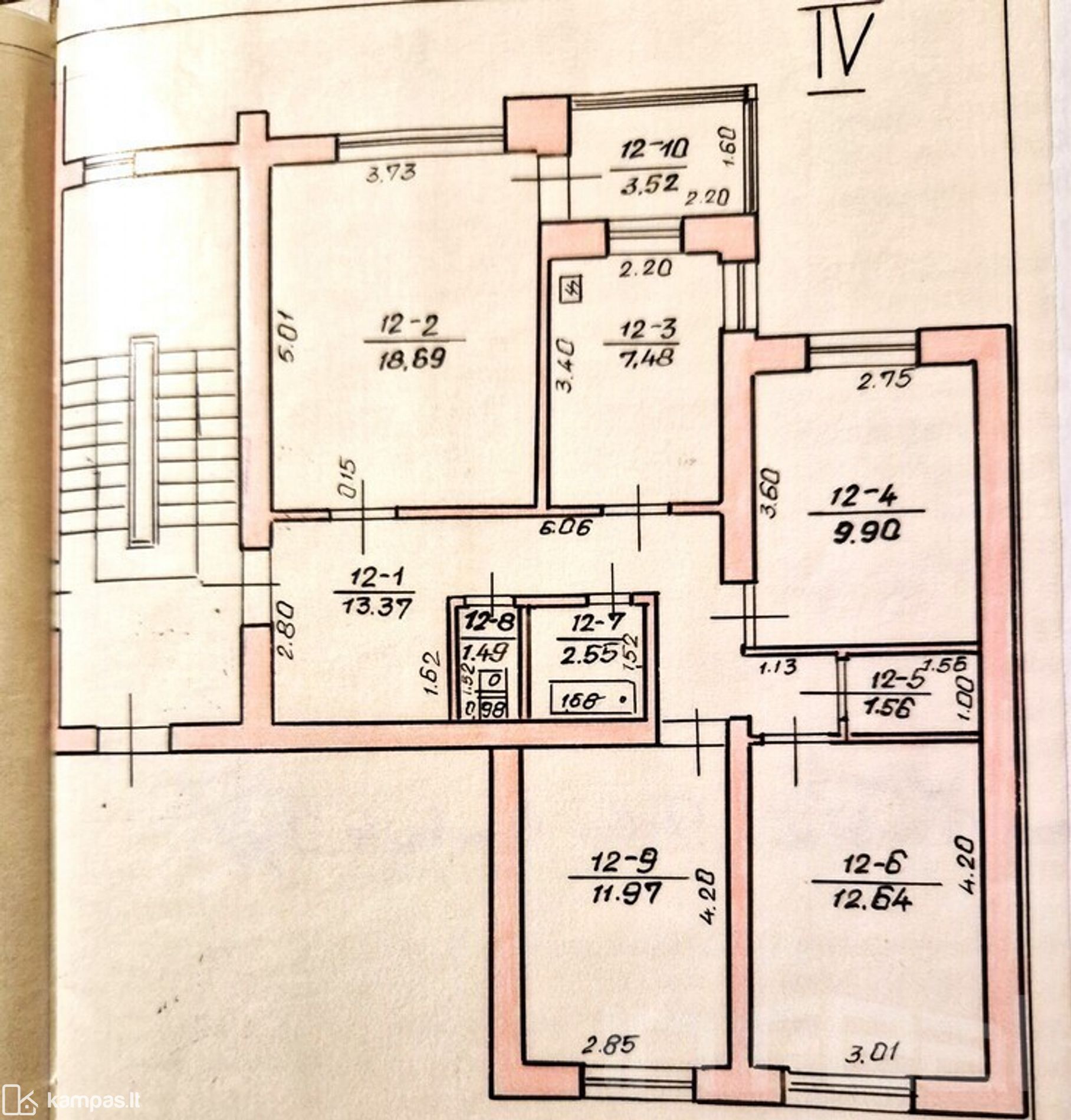 * kambarių plotai 18,69 kv.m.; 12,64 kv.m.; 11,97 kv.m. ir 9,90 kv.m.; virtuvė 7,48 kv.m.; vonia 2,55 kv.m.; WC 1,49 kv.m., sandėliukas 1,56 kv.m. ir didelis koridorius 13,37 kv.m.
