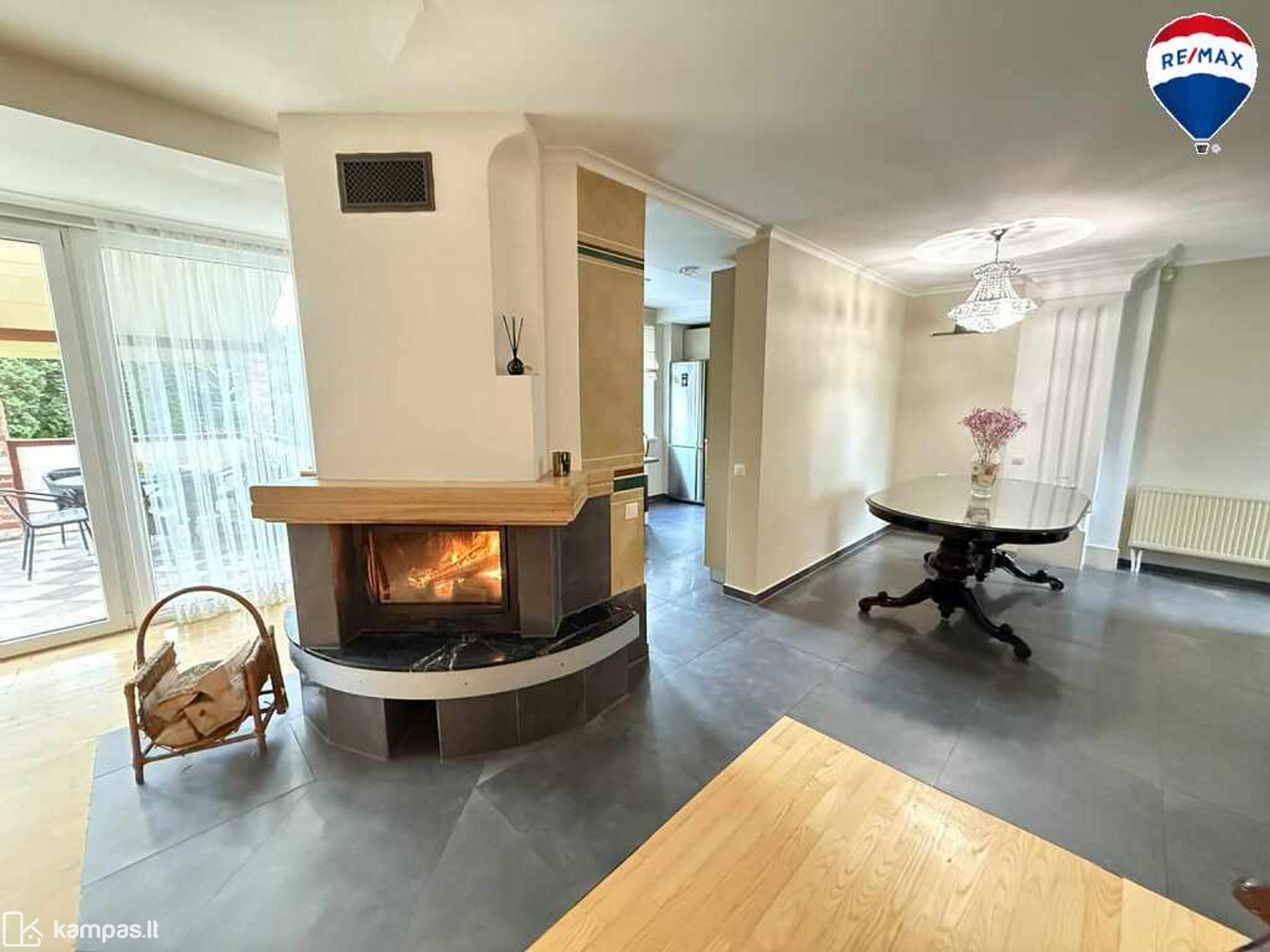 Pirmame aukšte – svetainė su židiniu suteikiančiu jaukumo ir šilumos, virtuvės zona ir išėjimas į terasą.