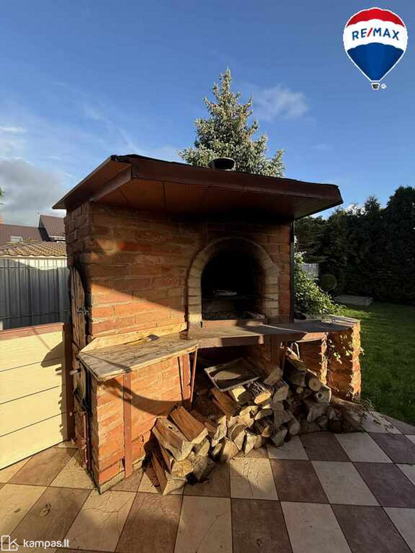 Terasoje įrengtas lauko židinys ir poilsio zona.