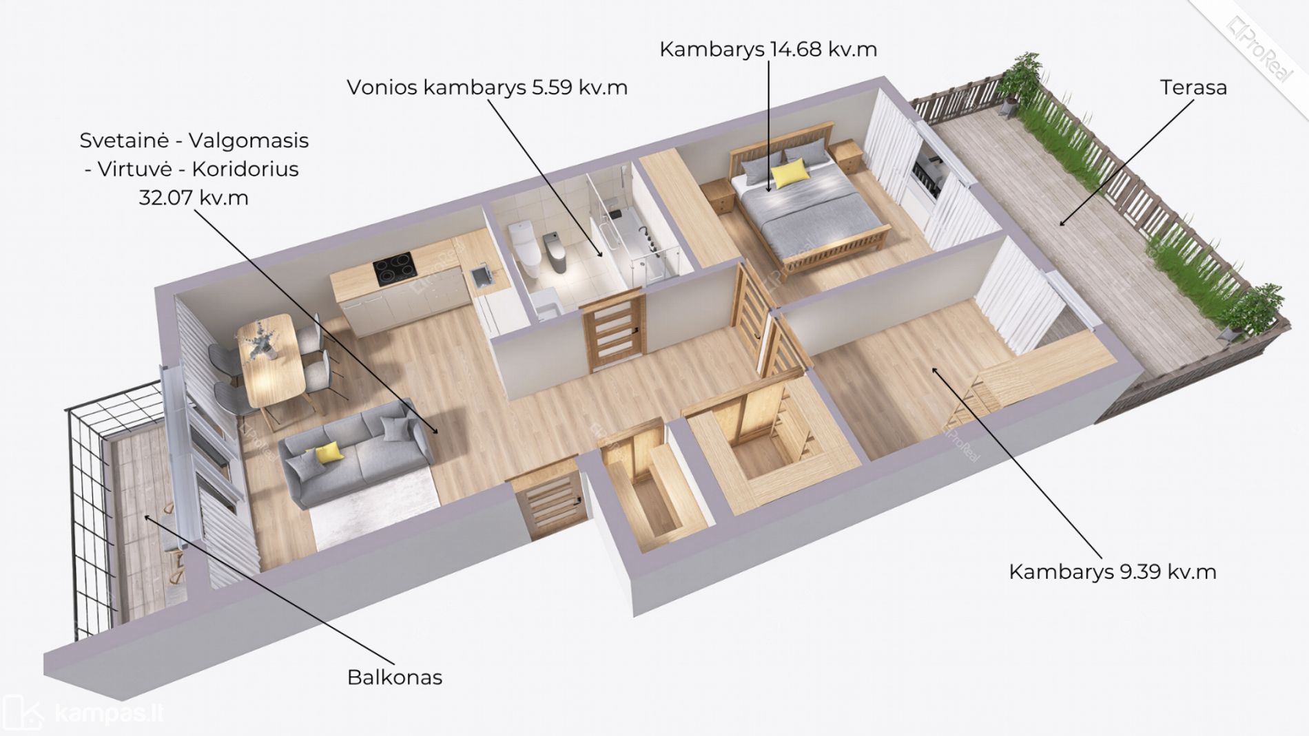 Miegamasis ir terasa yra rytinėje pusėje, svetainės ir virtuvės erdvė - vakarinėje, tad visą dieną galėsite džiaugtis saule ir šviesa.