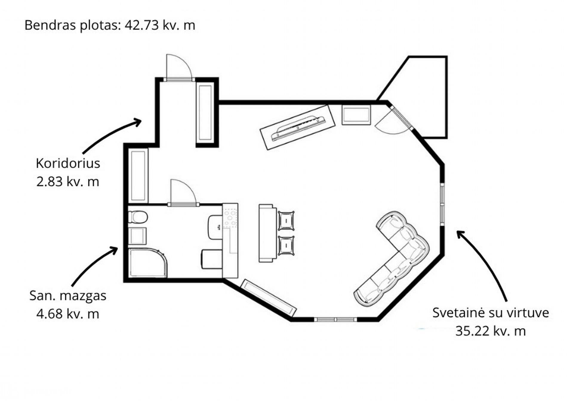 • Bendras plotas: 42.73 kv.m;
