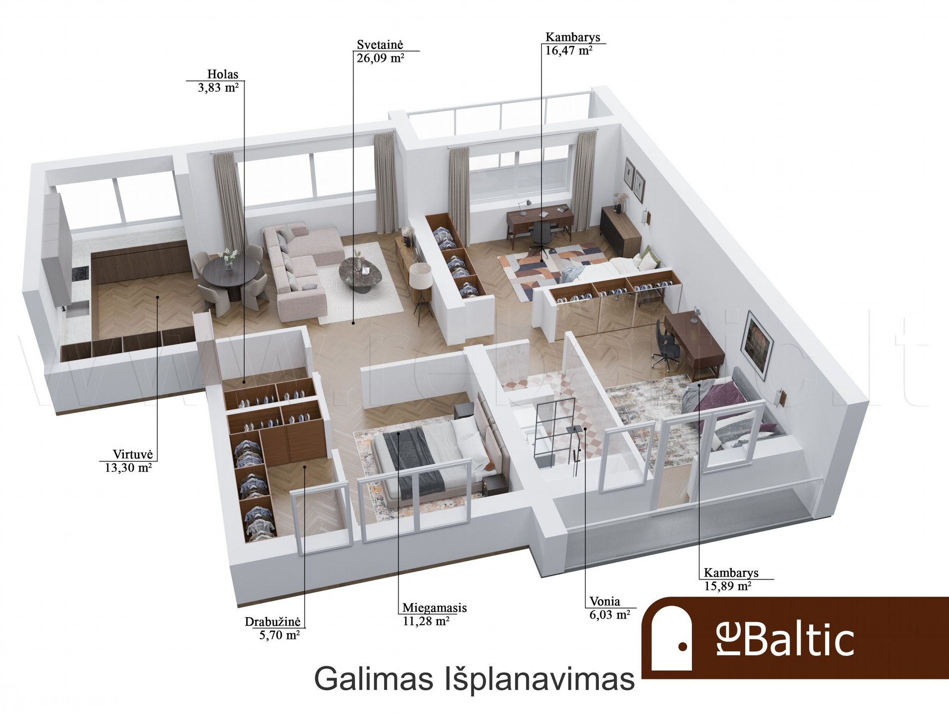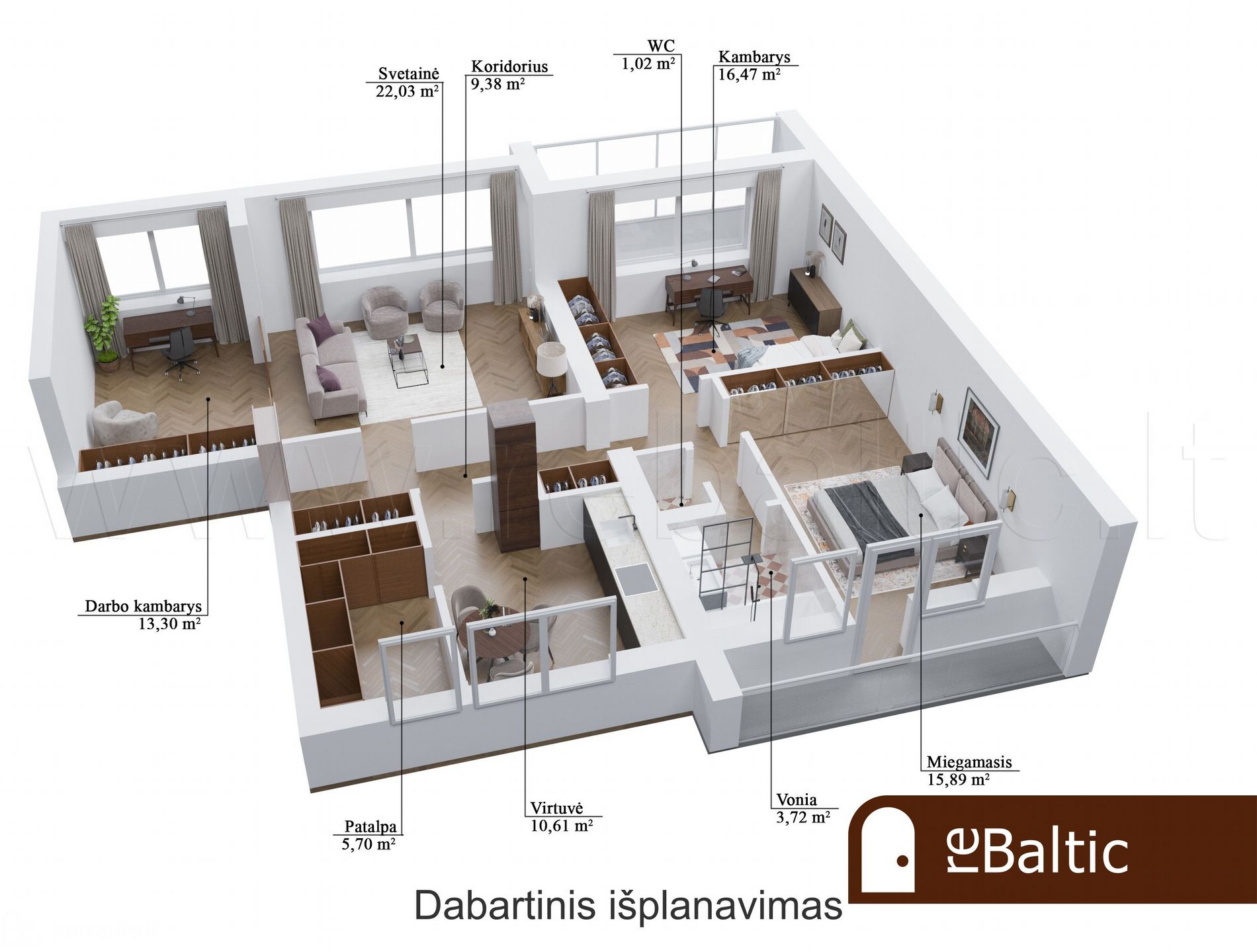 - Balkonas: 2 (vienas įstiklintas, kitas atviras)