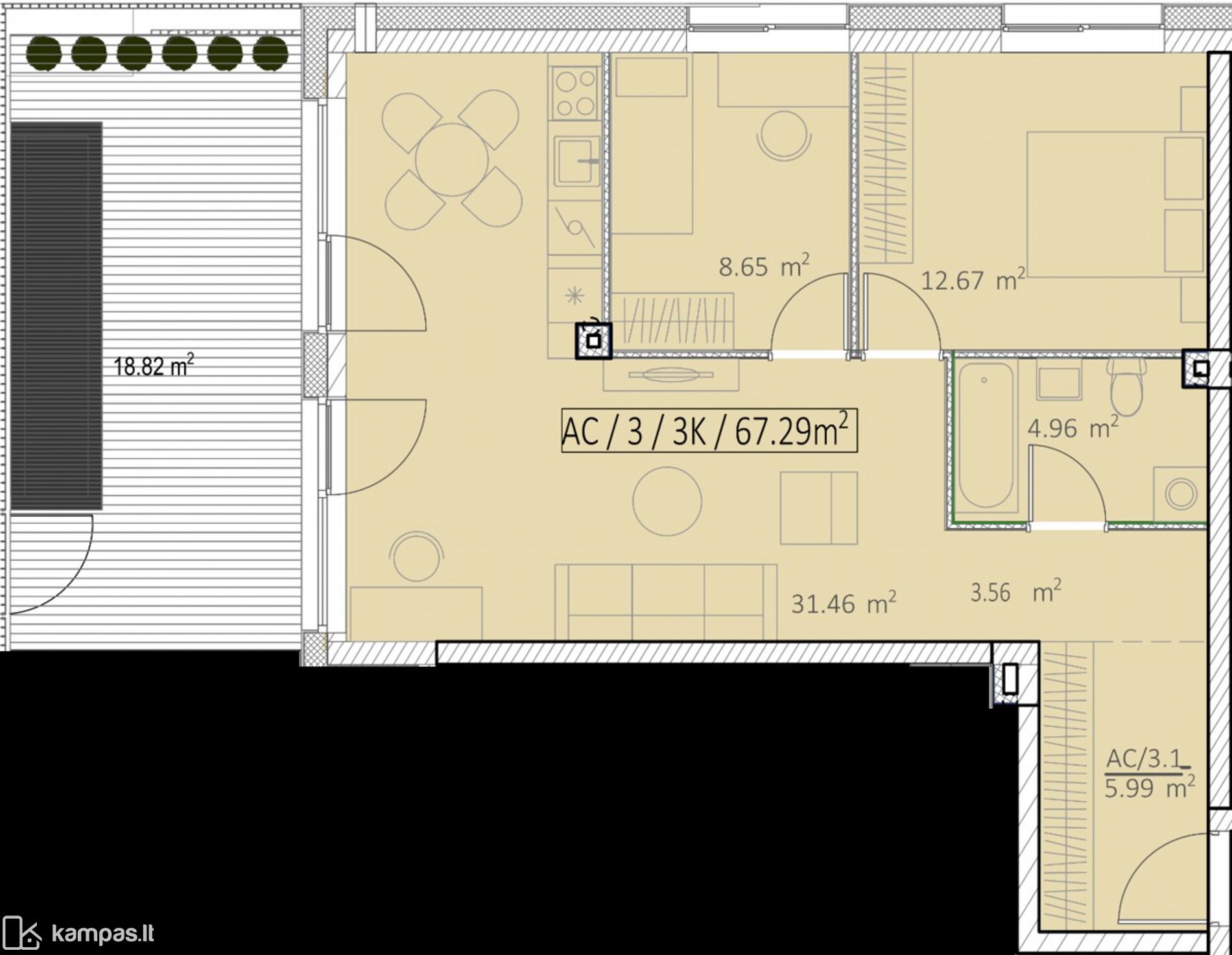 • Visi butai turi balkonus, o pirmojo aukšto butai - įrengtas lauko terasas