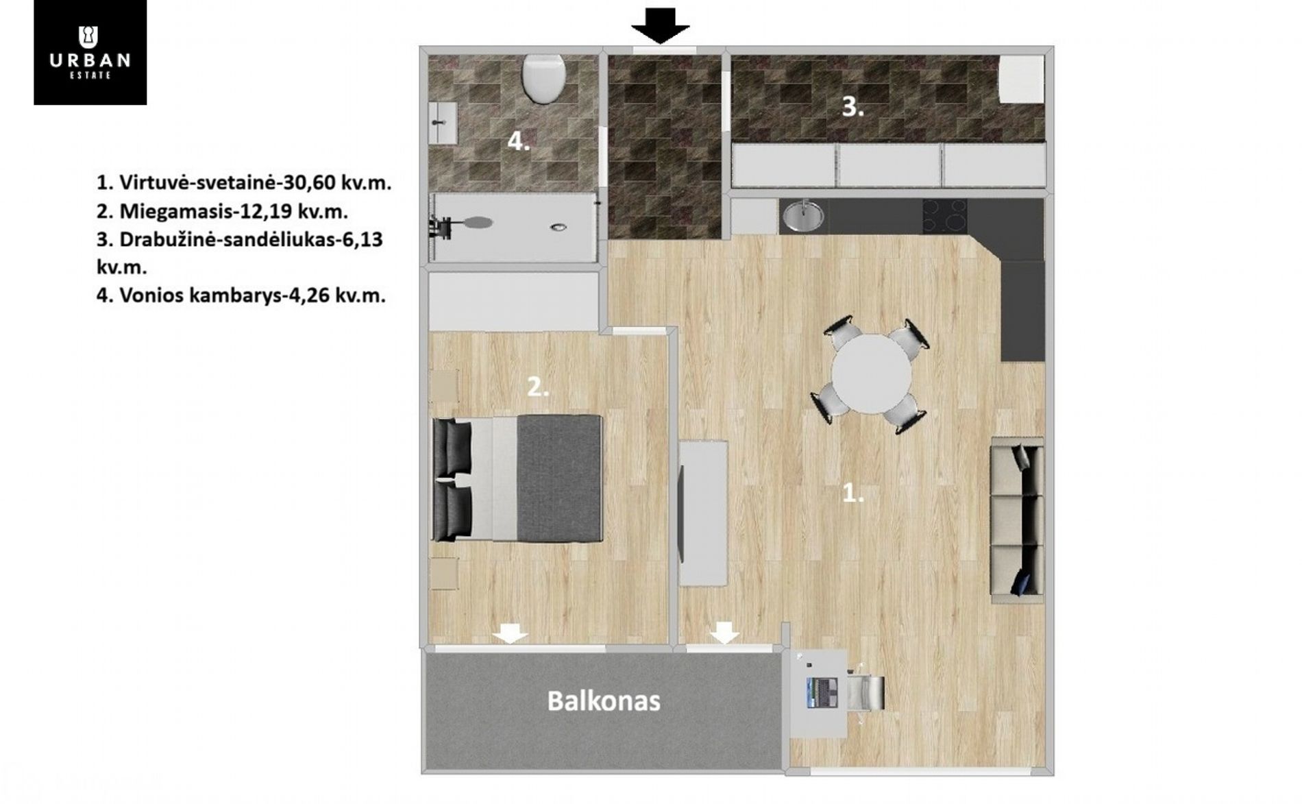 • Balkonas, į kurį patenkama iš miegamojo kambario ir iš svetainės.