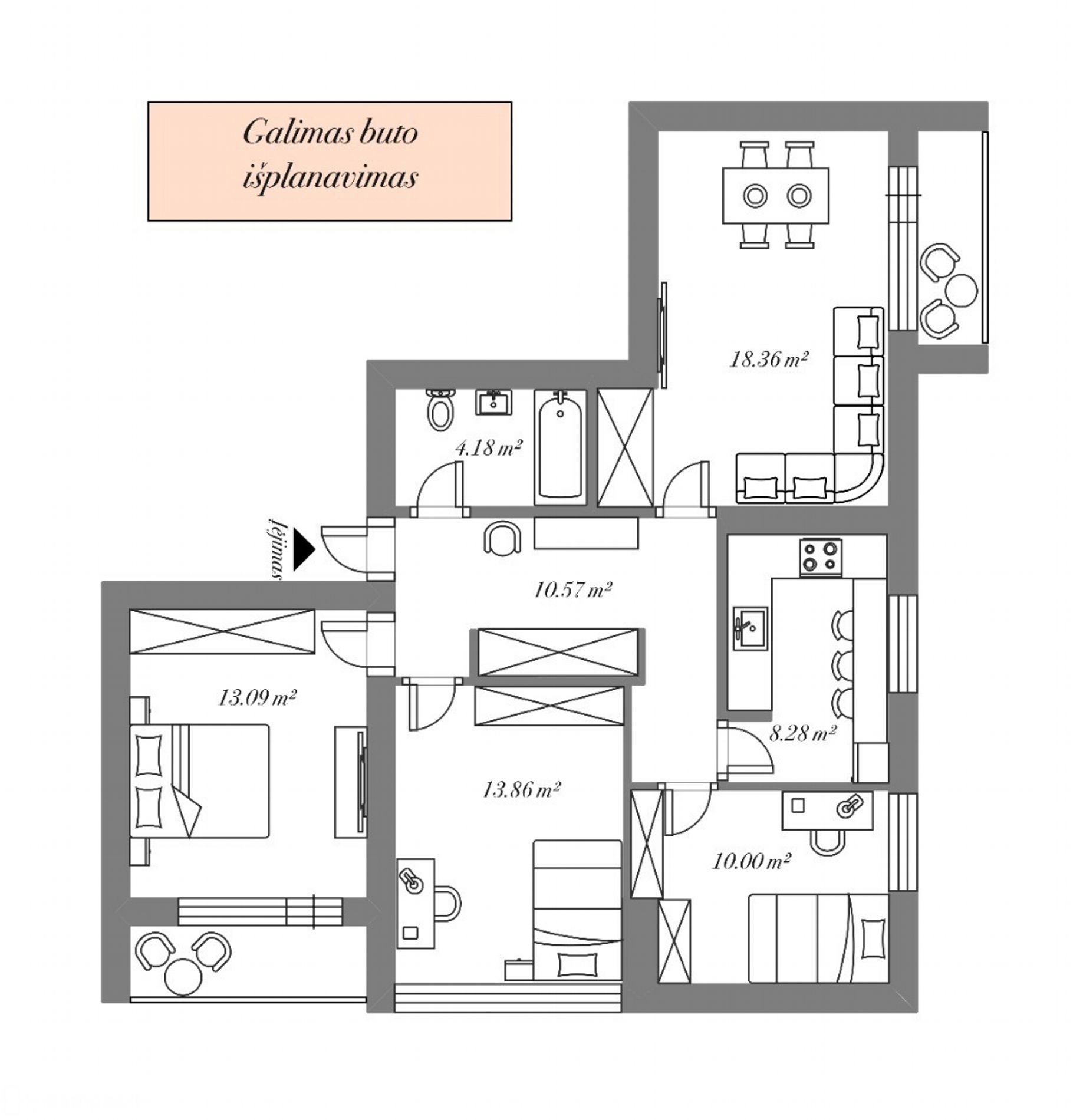 • 3 kambariai, galima perplanuoti į 4 kambarius (pridedamas planas, galimi ir kiti planavimo variantai);