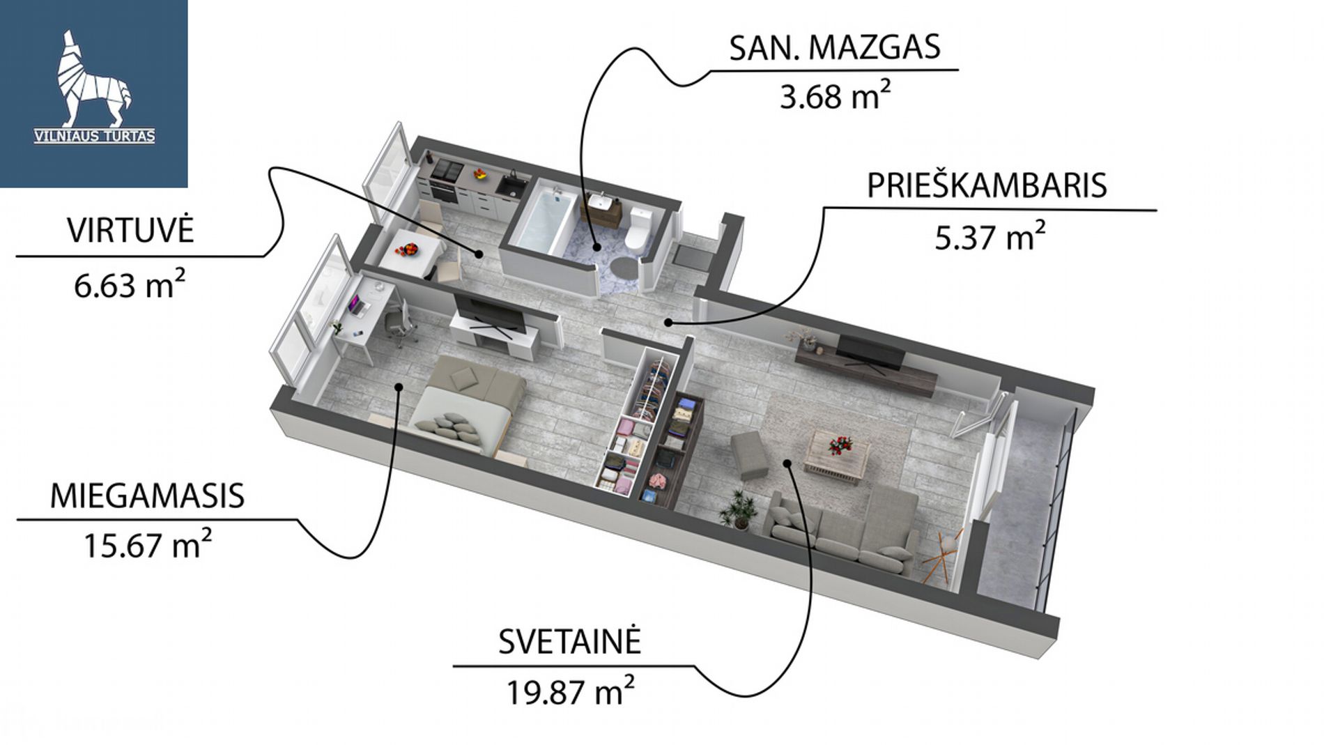 • Patogus išplanavimas: erdvi svetainė su balkonu, atskira virtuvė, miegamasis, vonios kambarys ir prieškambaris.
