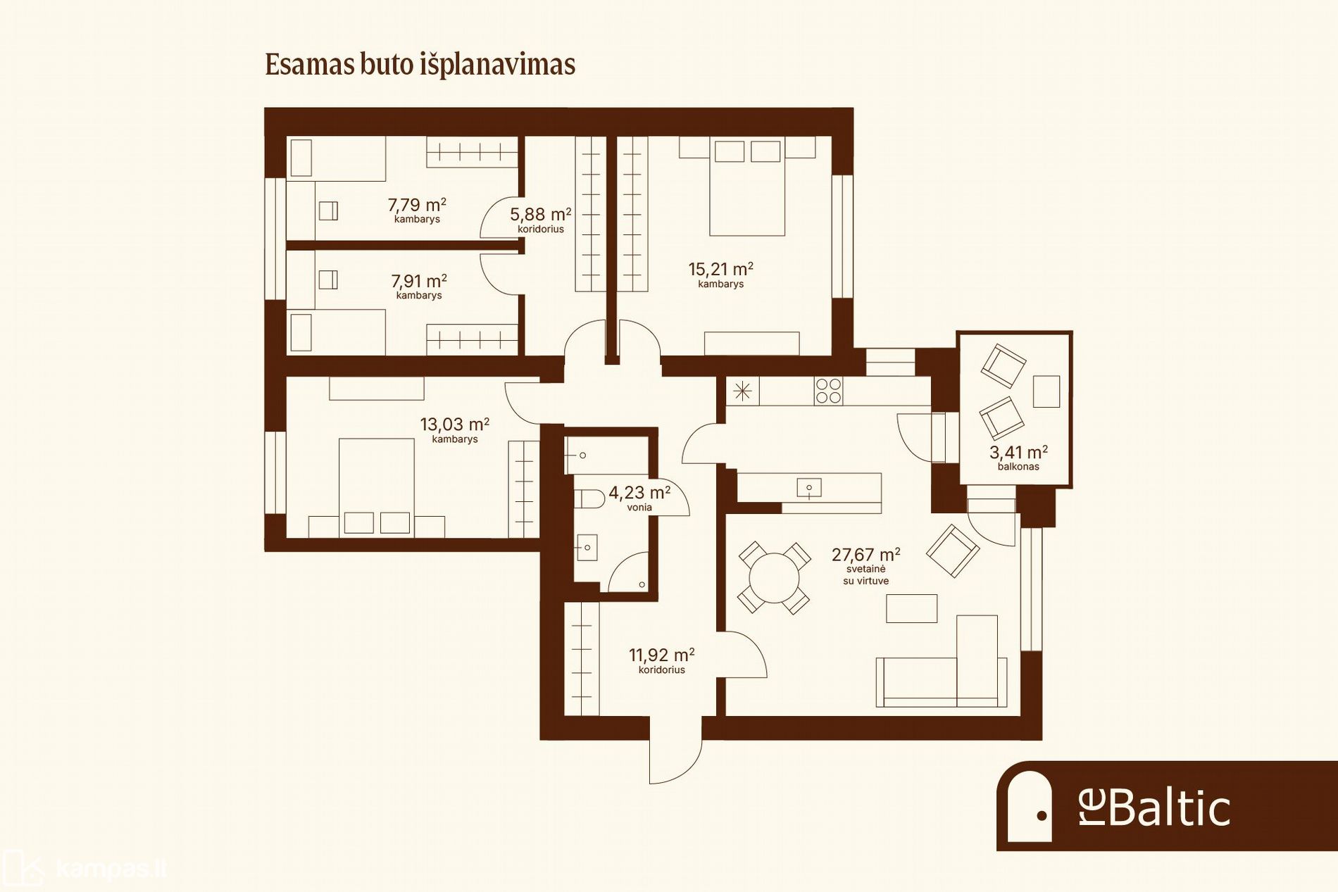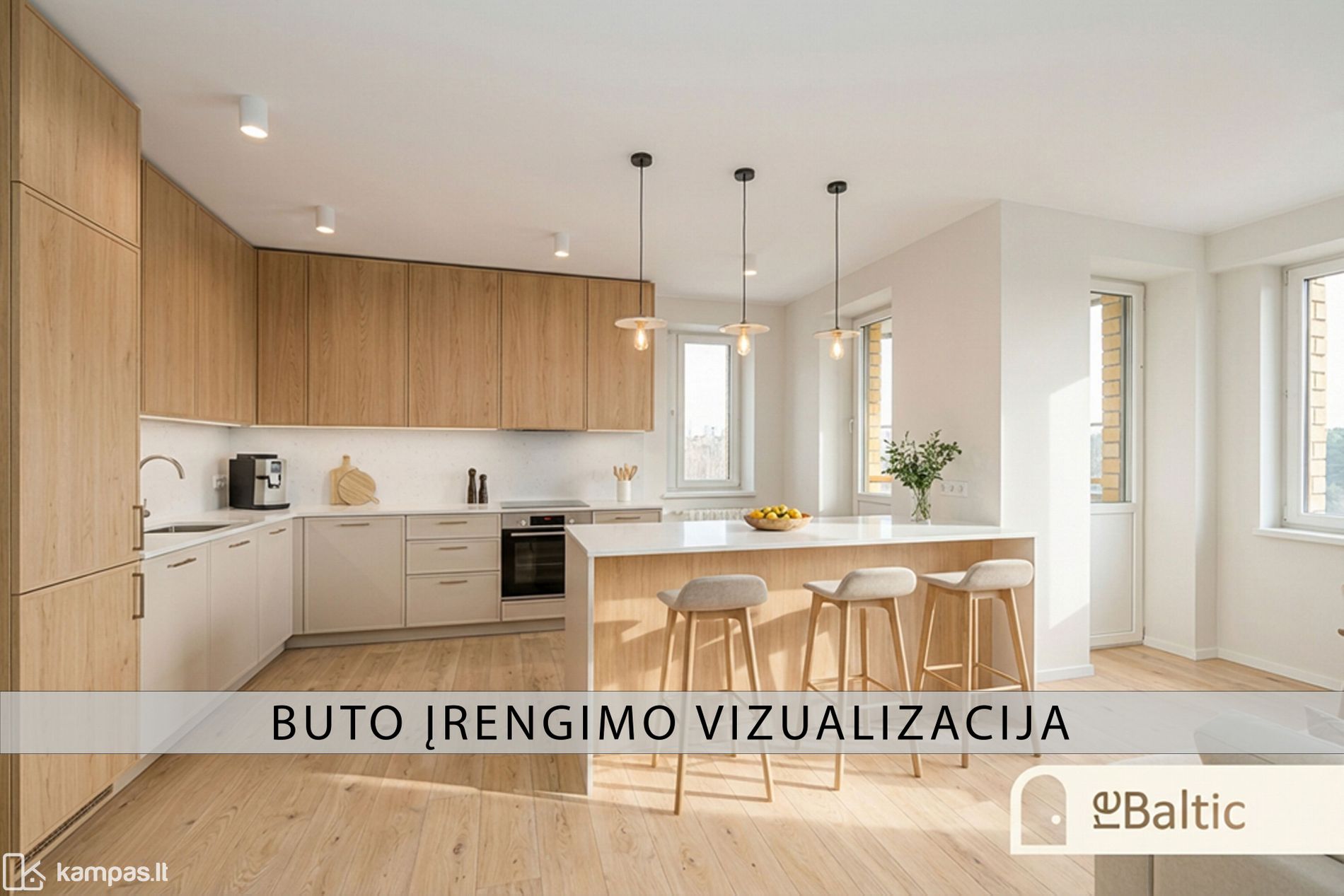 • Erdvi svetainė dalinai sujungta su virtuve (du išėjimai į balkoną).
