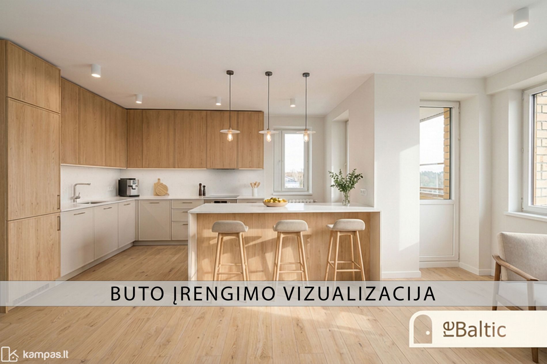 Galima lengvai perplanuoti į labai patogų trijų miegamųjų butą su erdvia svetaine kartu su virtuve.