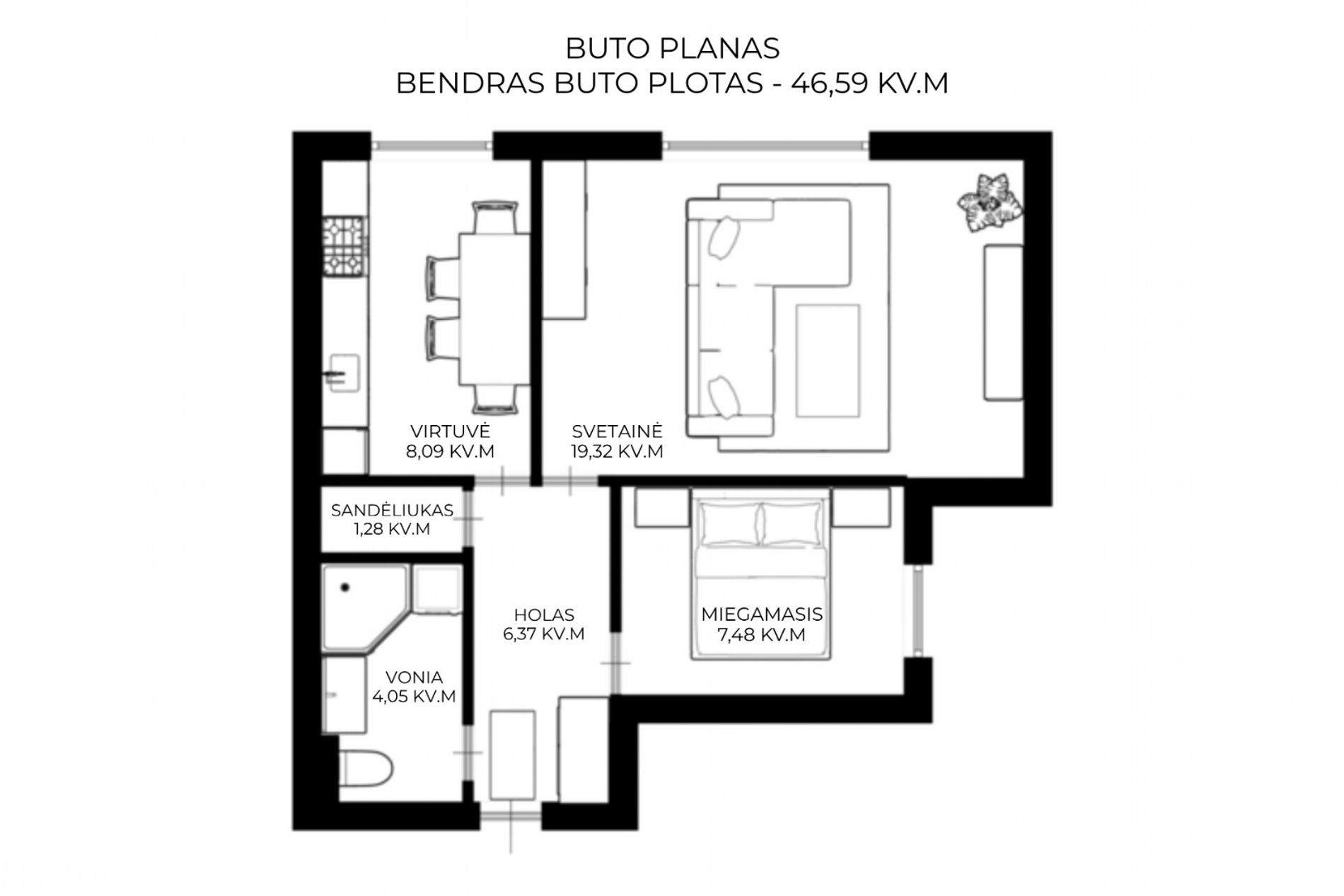 - Bendras plotas: 46.59 m2;