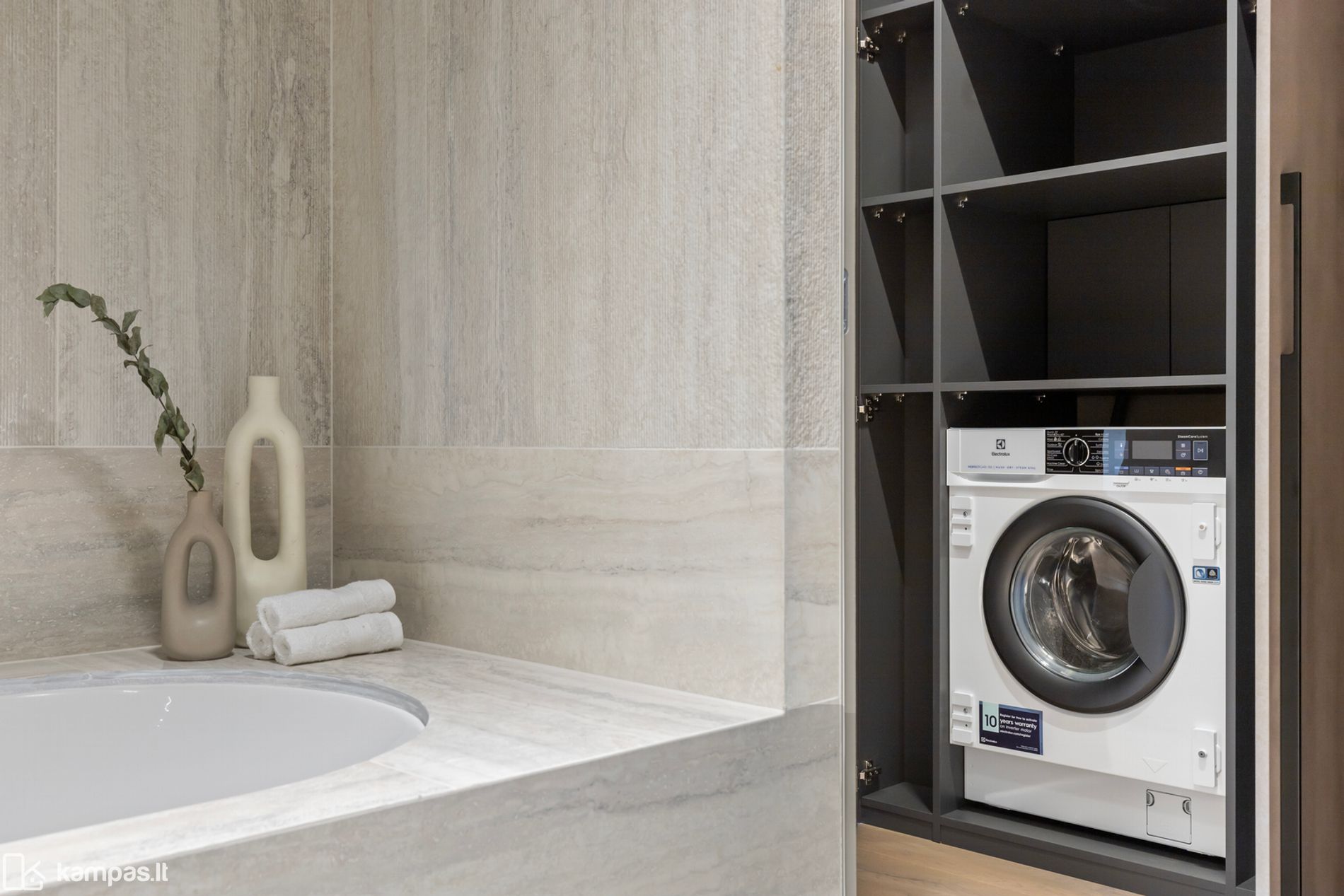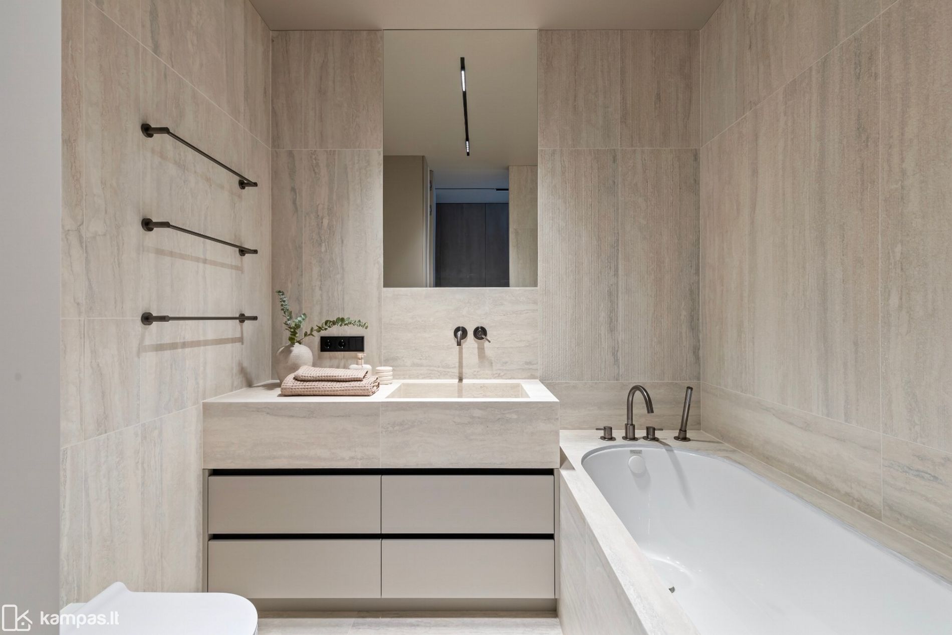 Erdviame vonios kambaryje – akmeninė vonia, dizainerių plytelės, šildomos grindys ir sienos su Wi-Fi termostatu, aukštos klasės santechnika, ventiliatorius, plytelėmis išklota kriauklė