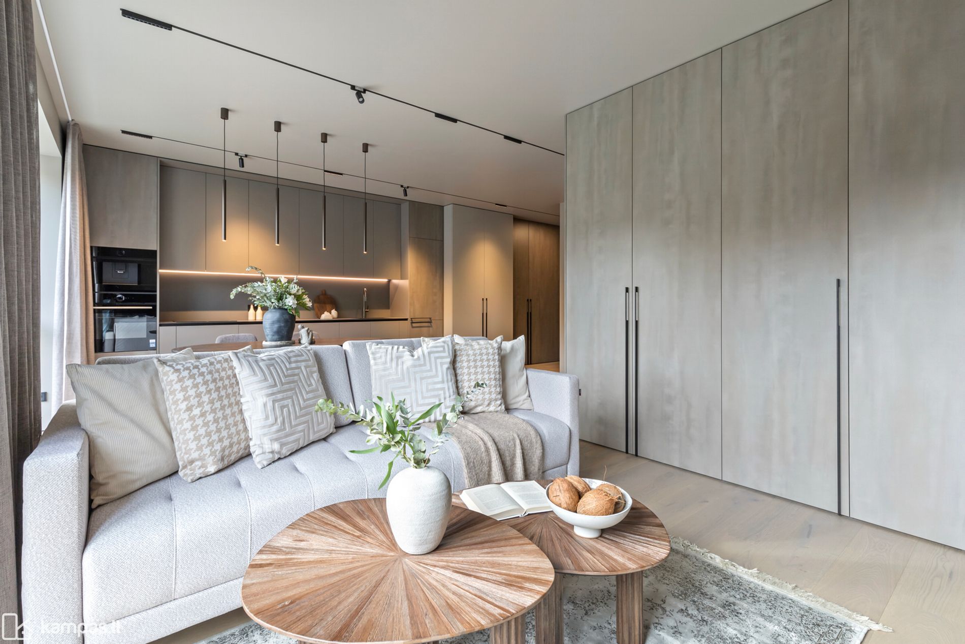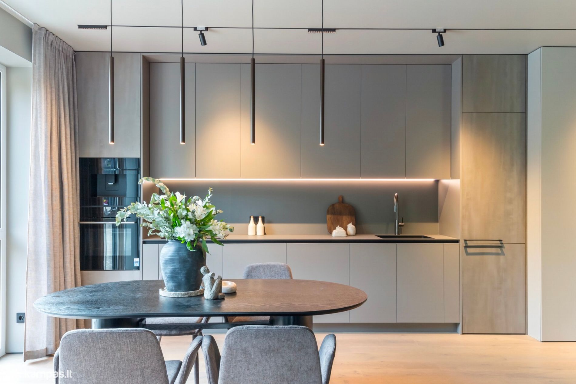 Projektuojant butą siekta modernumo ir funkcionalumo, suteikiant jaukumo jausmą per akcentinius baldus ir apšvietimą.