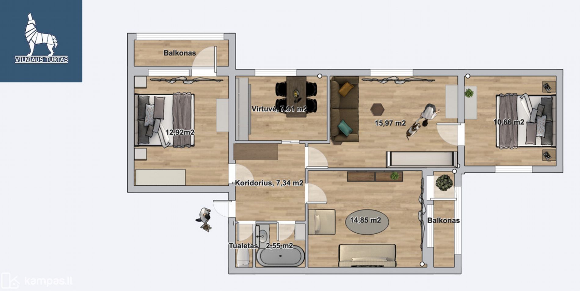 • Patogus išplanavimas – 3 nepereinami kambariai, svetainė, atskira virtuvė;