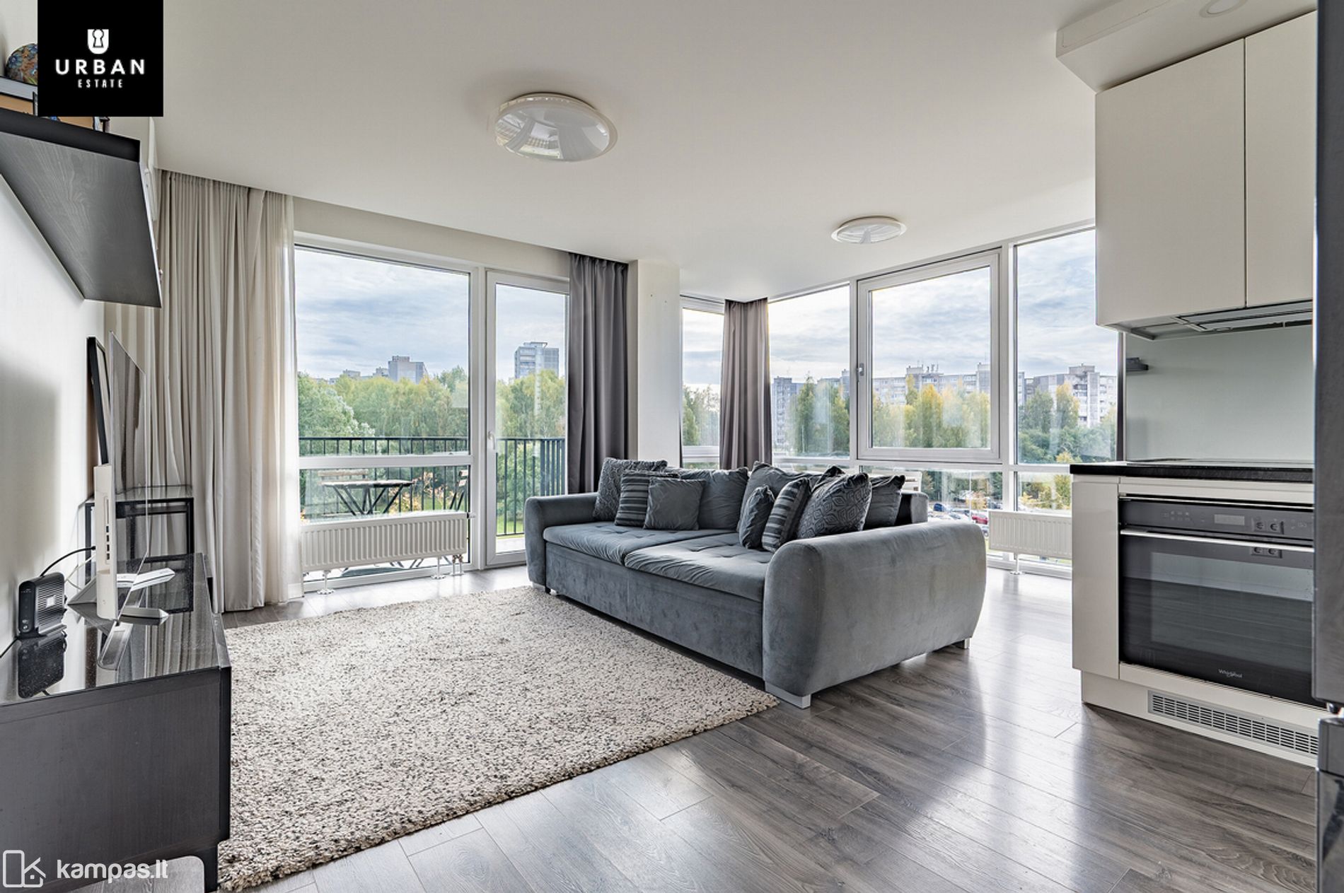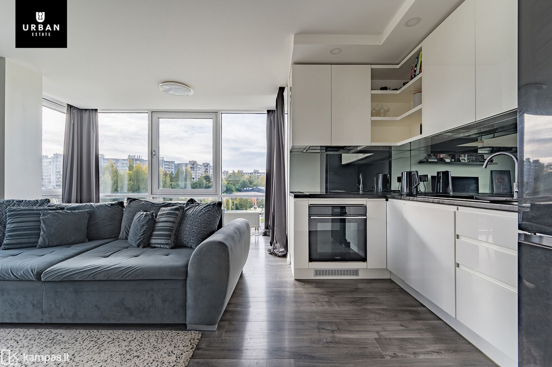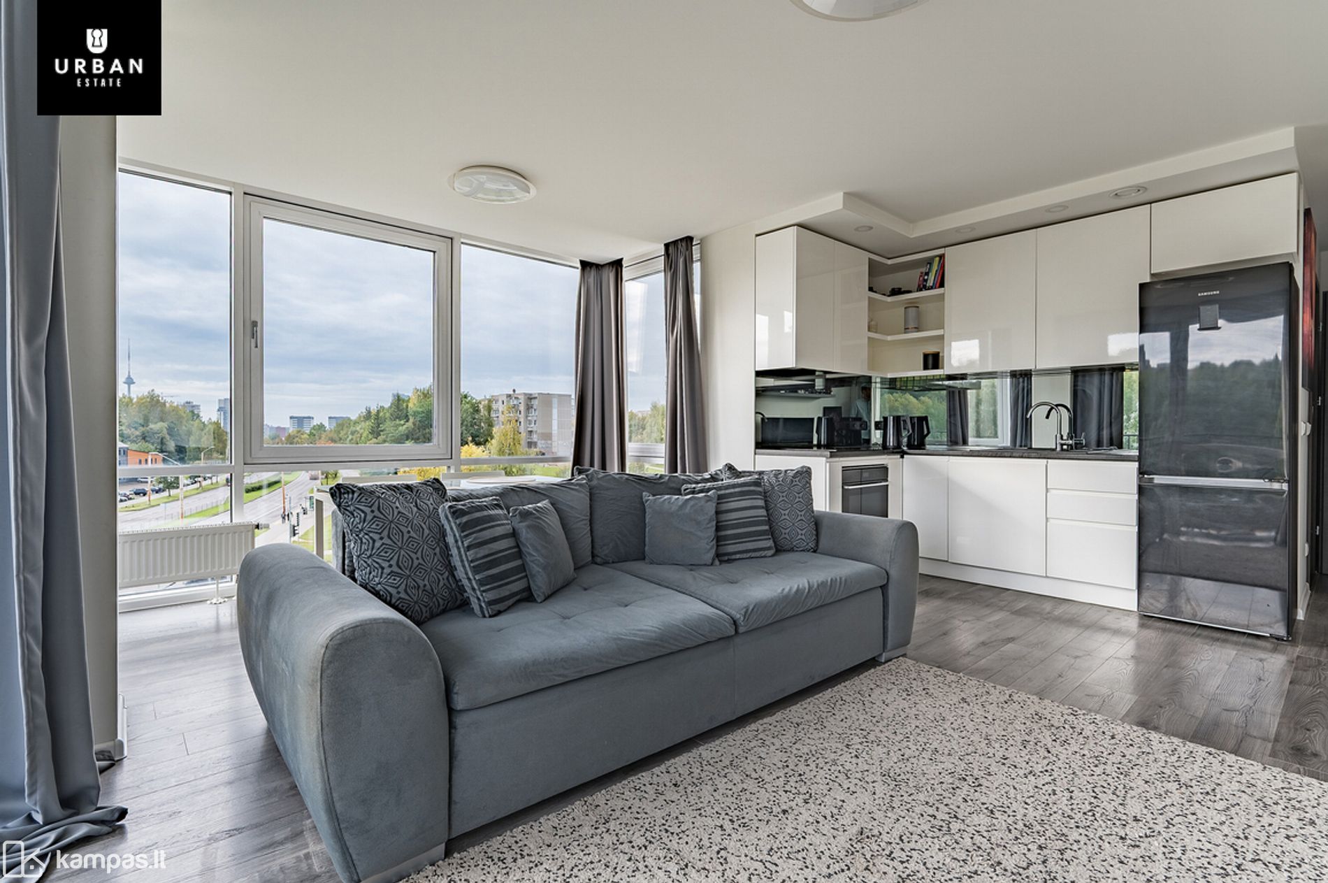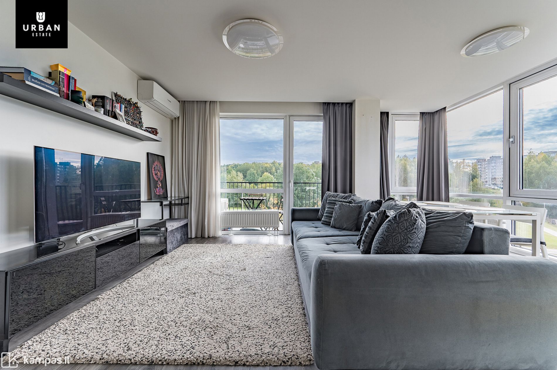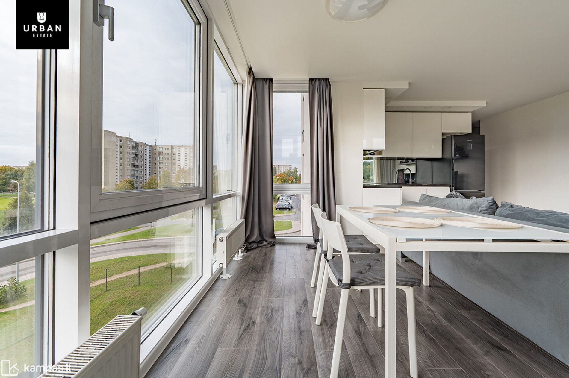 - Svetainės erdvė su dideliais langais iki grindų;