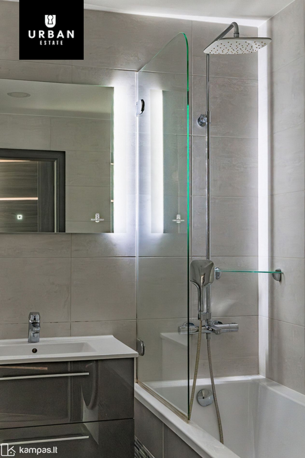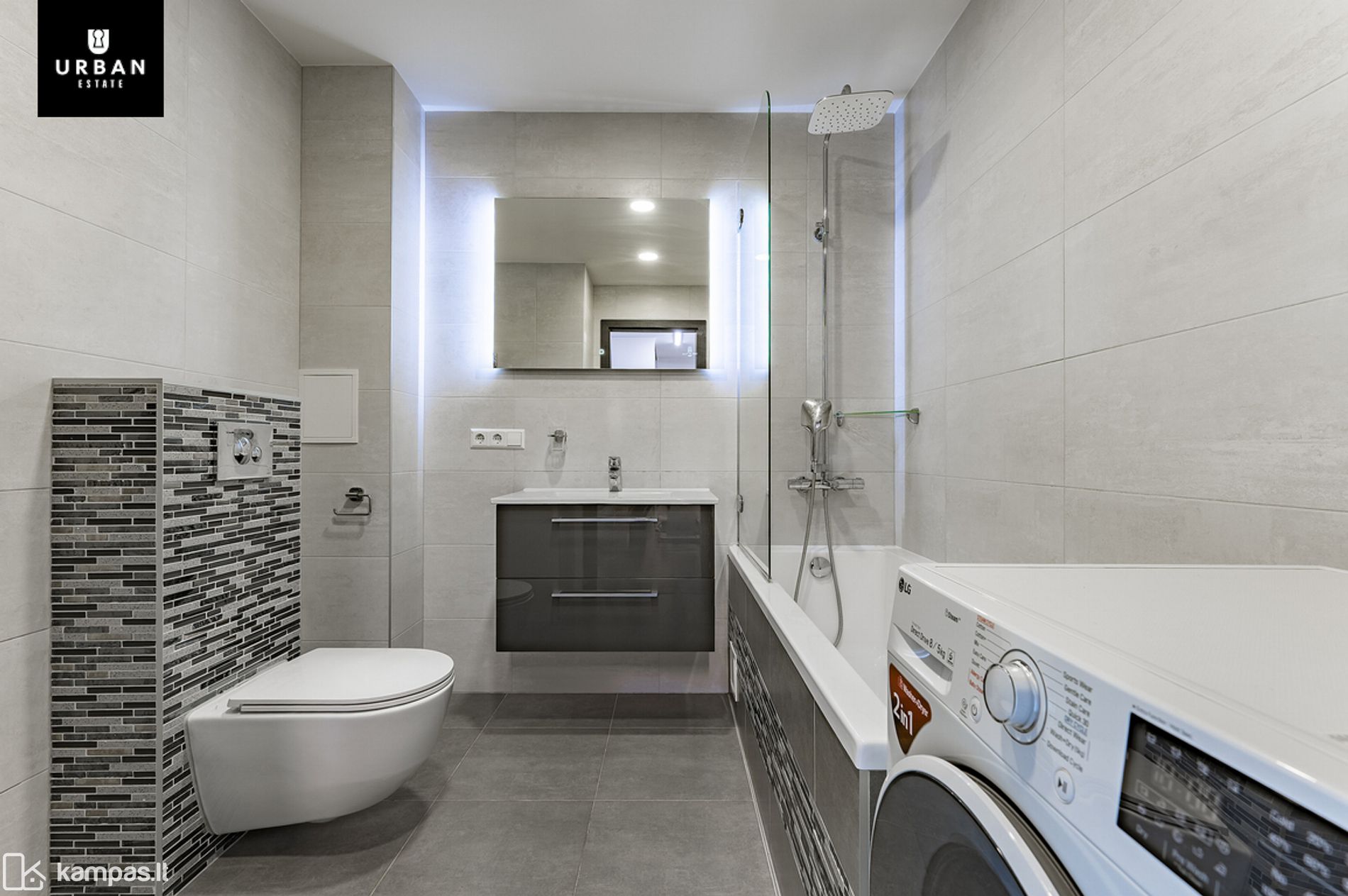 - Vonios kambarys su stilingu plytelių dizainu, LED veidrodžiu ir patogia erdve;