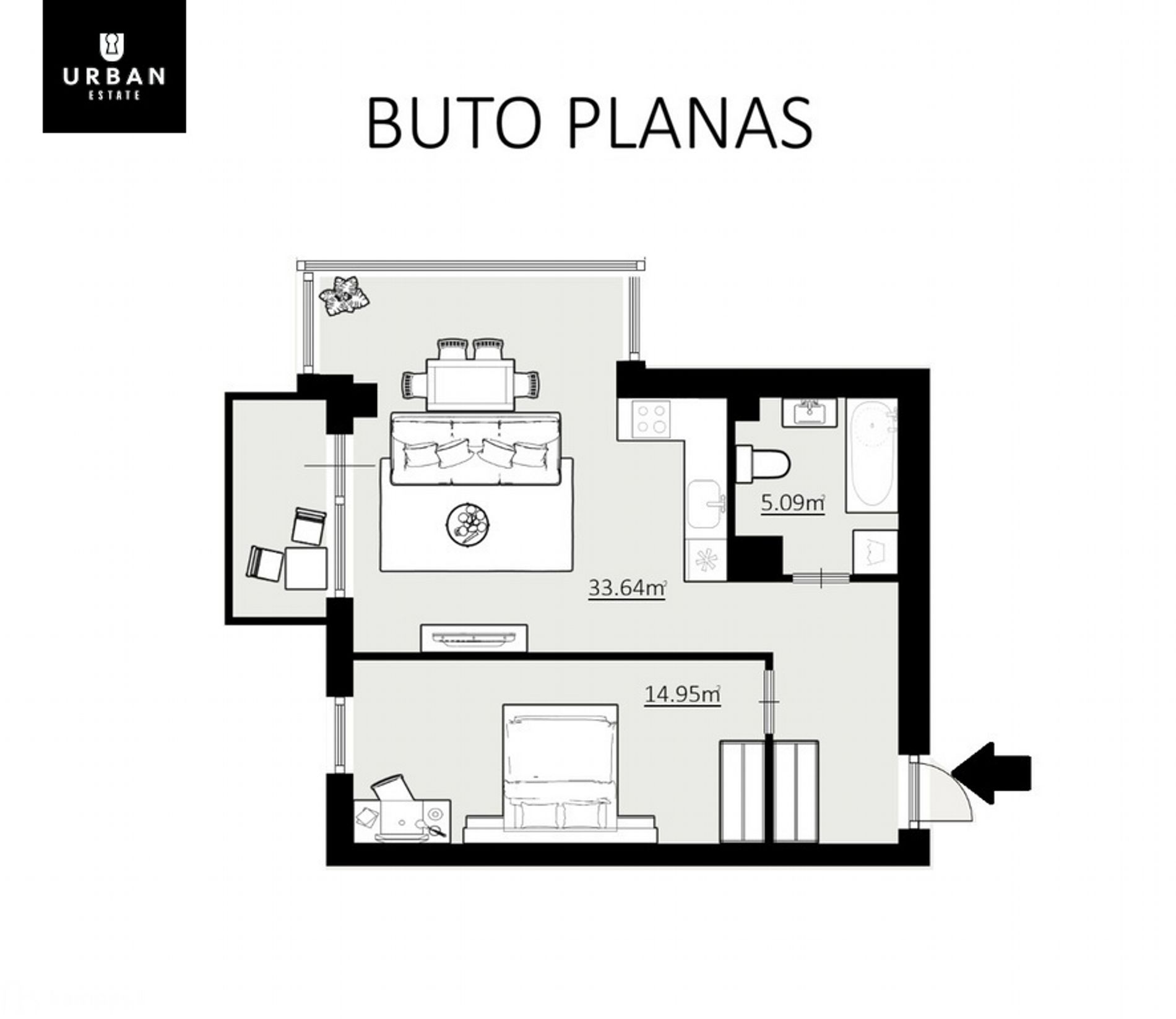 - Funkcionalus išplanavimas: šviesi svetainė su virtuve, atskiras miegamasis;