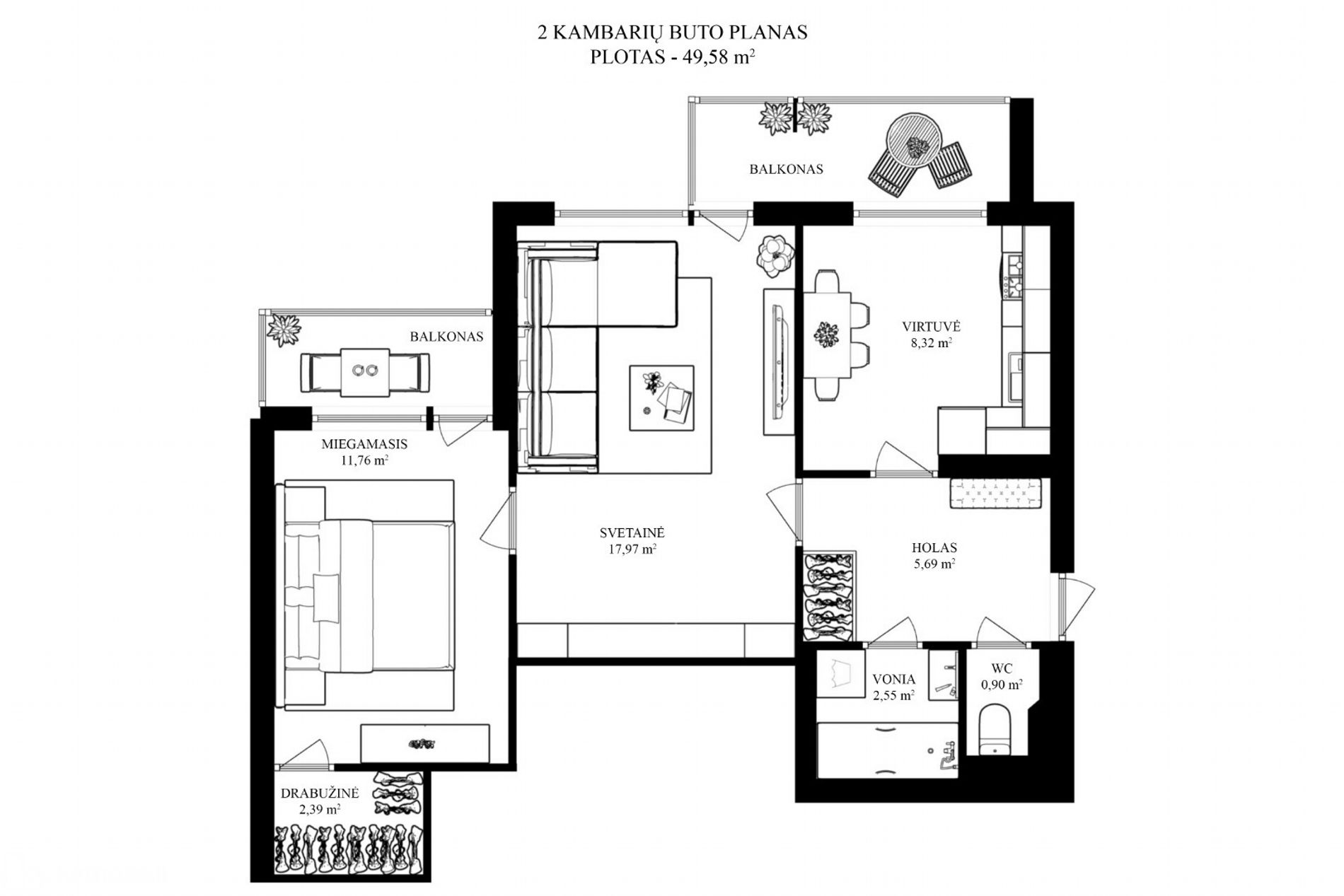 - Kambarių skaičius: 2 kambariai + virtuvė