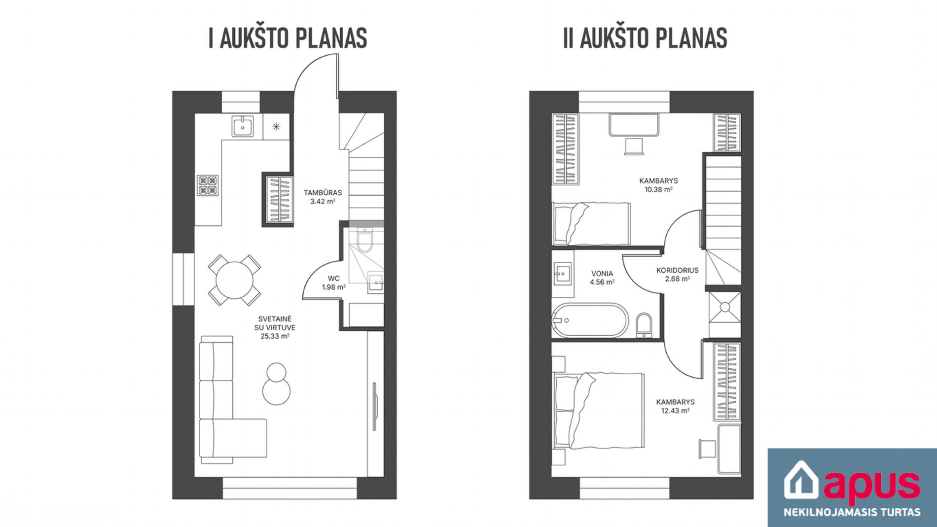 • 2 aukštai, 3 kambariai (2 miegamieji), 2 san. mazgai.