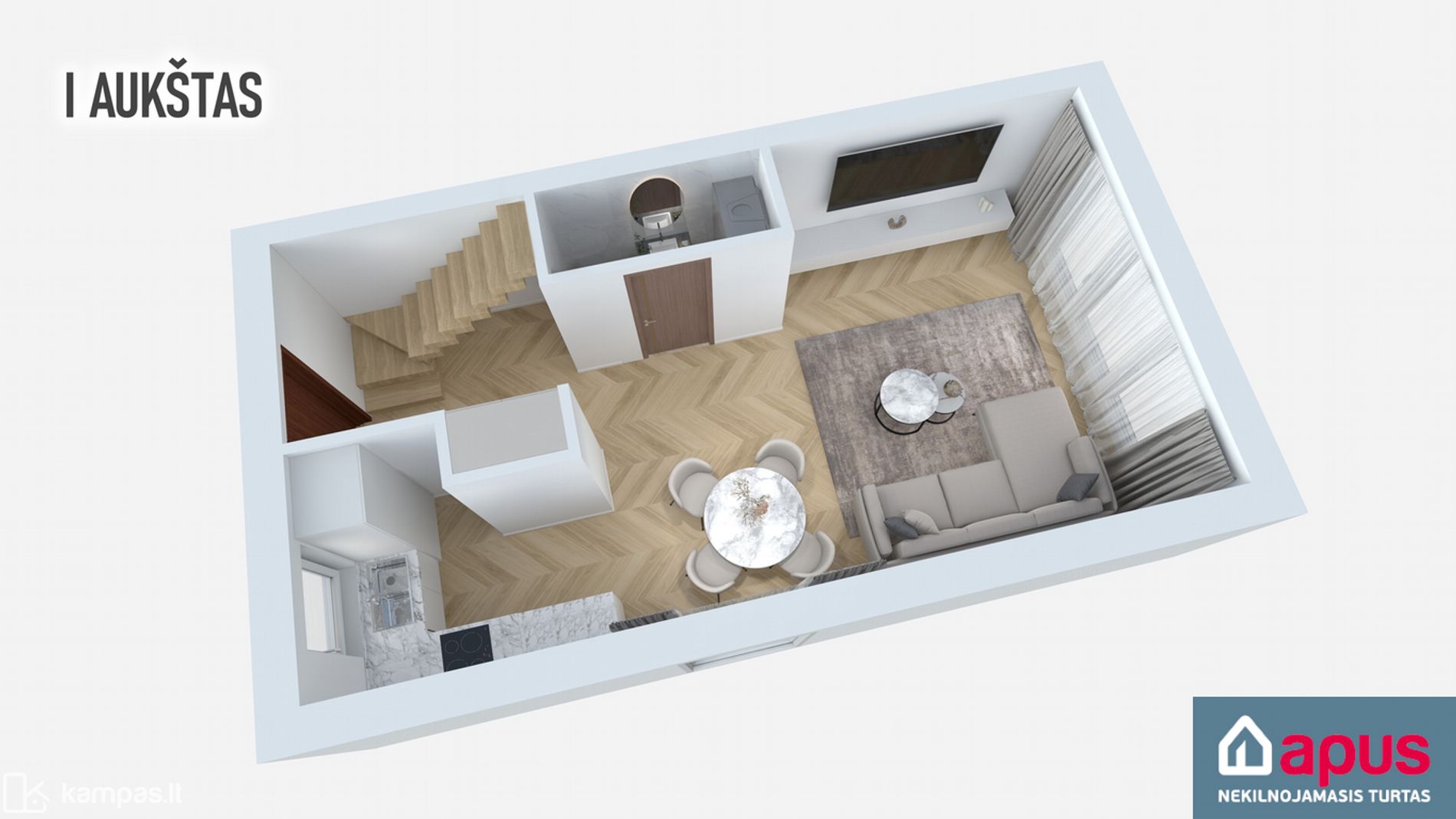 • 1 aukšte suplanuotas tambūras, virtuvė, valgomasis, svetainė ir san. mazgas.