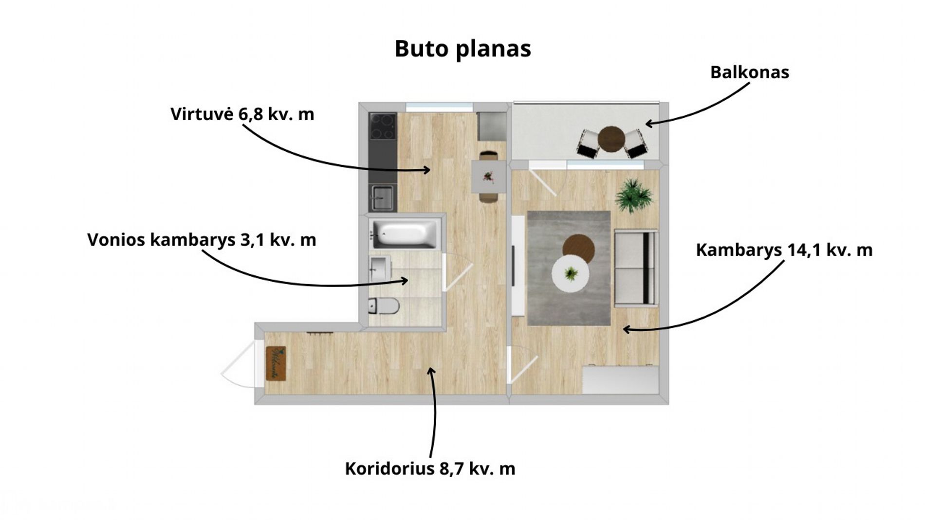 Funkcionalus išplanavimas, tvarkinga būklė, erdvus koridorius. Butas šviesus ir jaukus.